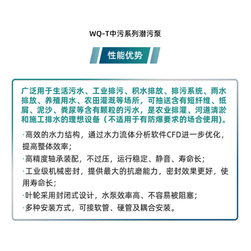 WQ-T中污系列潜污泵广泛应用于生活污水、工业排污、积水排放、排污系统、雨水排放、养殖用水及农田灌溉等场所,可抽送含有短纤维、纸屑、泥沙、粪尿等颗粒的污水,是农业排灌、河道清淤和施工排水的理想设备(不适用于防爆场合)。 产品优势: · 采用高效水力结构,经CFD流体分析软件优化,整体效率更高; · 配备高精度轴承,运行平稳、静音且寿命长; · 工业级机械密封,抗磨性强,密封性能优异,延长使用寿命; · 封闭式叶轮设计,效率高,不易堵塞; · 支持多种安装方式,可连接软管、硬管或采用耦合安装,灵活便捷。 该系列产品涵盖多种型号,功率从0.75kW至7.5kW,流量范围广,扬程可达25米以上,满足不同工况需求。适用于DN50至DN150管径系统,具备良好的潜水性能(最大潜水深度可达5米),运行可靠,维护简便。