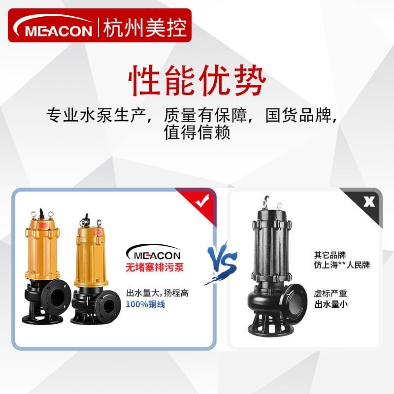 MEACON无堵塞潜水排污泵,专为高效排污设计,具备九大核心升级优势,一机解决各类污水排放难题。采用全铜电机,配备加粗铜芯线,动力强劲,效率高,使用寿命长。泵体为一体式铸铁精铸而成,机身加厚30%,坚固耐用,表面喷镀处理,防锈耐腐蚀。 产品配备无堵塞叶轮与大流道设计,底部大孔进水,上水快,有效实现大流量抽排,垂直扬程最高可达40米。可选配搅匀刀,快速搅动沉底污泥,覆盖范围达2-5米,无惧泥沙与杂物。支持国标法兰和丝口连接,兼容硬管与软管出水方式,灵活适配多种安装环境。 广泛应用于生活污水、工业废水、下水道清理、河道排污、工厂锈水处理及防洪排涝等场景。提供多种型号选择,涵盖50mm至150mm配管规格,流量最高达120m³/h,功率从0.75kW至7.5kW,满足不同工况需求。JYWQ系列搅匀款更可实现自动搅匀排污,提升清淤效率。 人性化设计包含便携吊环、不锈钢螺丝、加高底座等细节,使用安全便捷。水泵需确保工作时整体浸入水中,避免干转烧机。MEACON排污泵,以可靠品质与卓越性能,成为您排污系统的理想之选。