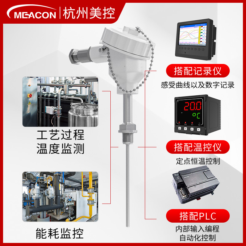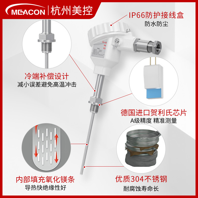 MEACON(杭州美控)防爆型高精度温度传感器,专为防爆环境设计,适用于石油、化工、冶金、煤矿、电力等高危工况。产品型号TSR,采用铠装热电阻PT100元件,具备IP66防护等级和Ex db IIC T6 Gb防爆标志,确保在严苛环境下的稳定测量。 内部升级填充高纯度氧化镁条与氧化镁粉,提升导热性、绝缘性,搭配冷端补偿结构,有效减少测量误差并防止高温损坏。采用高强度不锈钢铠材,延长使用寿命。可选配温度变送模块,稳定输出4-20mA或1-5V信号,兼容PLC、温控仪、记录仪等多种设备,实现自动化控制、恒温调节与数据记录。 支持法兰、卡箍、螺纹、直插等多种安装方式,适用于垂直、倾斜及弯曲管道安装。广泛应用于化工反应监控、管道气液测温、能耗计量、城市供热管网等场景。拥有近百项技术专利,通过ISO、SGS、CE及国家防爆认证,年产能超30万套,仓储储备充足,支持24小时速发,服务超70万客户,覆盖全国30多个技术服务网点。