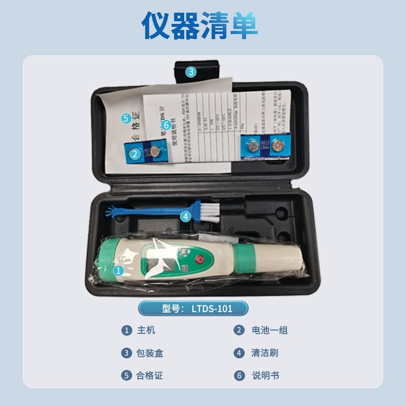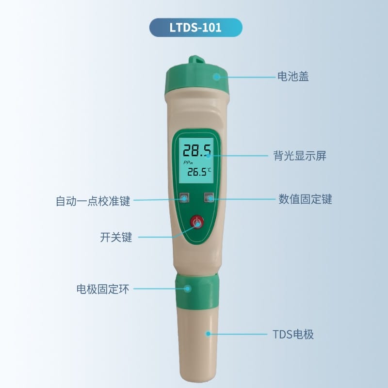 便携式TDS水质检测仪LTDS-101,帮助您快速判断水质好坏,为健康保驾护航。TDS值反映水中溶解性固体总量,数值越低,水质越纯净。本仪器广泛应用于家庭饮水、水族箱、无土栽培、农业养殖、游泳池、工业及科学实验室等场景。 【核心功能】 - 量程:0-9999 PPM,分辨率1PPM,精度±2%FS - 自动温度补偿范围:0℃~50℃ - 配备全金属特制探头,响应灵敏,耐用性强 - LCD高清背光显示屏,读数清晰直观 - 支持℃/℉单位切换,满足多样化需求 - 一键数值锁定(HOLD)功能,便于记录数据 - 单点自动校准,操作简便,确保测量准确性 【使用提示】 - 使用前请将电极浸泡于清水中5-10分钟以激活传感器 - 建议使用标准缓冲液进行定期校准,避免测量误差 - 当屏幕显示电池符号时,请及时更换纽扣电池(不可新旧混用) - 测量时仅需浸没电极环线部分,切勿整支投入水中 【标配清单】 1. 主机 ×1 2. 纽扣电池 ×4 3. 包装盒 ×1 4. 清洁刷 ×1 5. 合格证 ×1 6. 说明书 ×1 严选环保原材料,拒绝劣质再生料,安全可靠。LTDS-101是您日常水质监测的理想选择,让每一滴水都看得见、信得过。