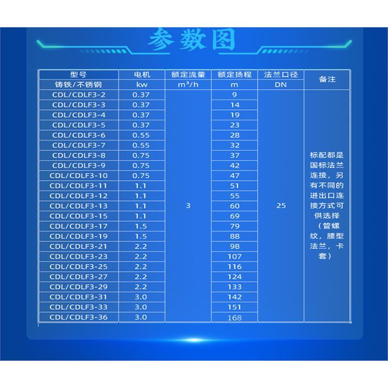 南方泵业CDL/CDLF系列轻型立式多级离心泵,是一款高效、节能、低噪音的多功能水泵。产品结构紧凑、维护方便,适用于从自来水到工业液体的多种介质输送。其中CDL系列适用于无腐蚀性液体,CDLF系列可耐轻度腐蚀性液体,满足不同工况需求。 该泵具备强劲动力、运行稳定、坚固耐用、安装便捷等优点,广泛应用于高层建筑二次供水、工业流程增压、冷却系统、锅炉给水、水处理(反渗透、超滤、蒸馏)、农田灌溉及喷滴灌系统等场景。 技术特点: - 电机防护等级IP55,绝缘等级F,全封闭风冷设计 - 标准电压兼容单相与三相供电 - 使用温度范围广:常温型-15℃~70℃,热水型可达120℃ - 法兰连接符合国标,可选管螺纹、腰形法兰、卡套等接口方式 - 材质可靠:不锈钢泵体,抗腐蚀性强 提供一年质保,原厂正品,全国联保,专业客服支持,闪电发货,售后无忧。选择南方泵业,品质与服务双重保障。