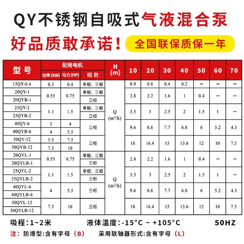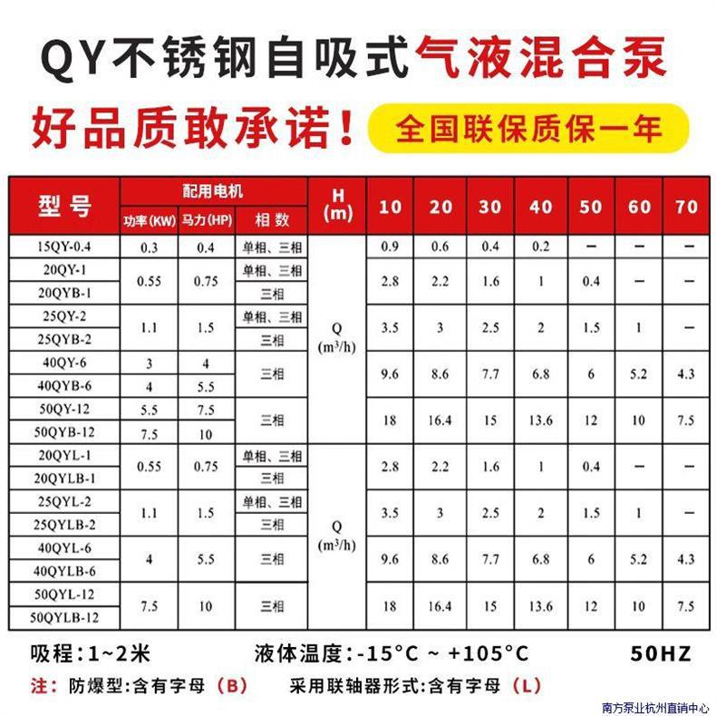 南方泵业QY系列不锈钢自吸式气液混合泵,专为输送干净、低粘度或含细微杂质的液体设计,分为普通型(QY/QYL)和防爆型(QYB/QYLB),适用于易燃易爆液体的安全输送。工作温度范围为-15℃至+105℃,最高环境温度可达+40℃,吸程1~2米,适用于50Hz电源系统。 该泵具备边吸水边吸气、泵内加压混合的独特功能,可产生20μ~30μ微细气泡,气液溶解效果优异,溶解率高达95%以上。相比传统方式,显著提升效率,省去空气压缩机、高压溶气罐、混合器等复杂设备,降低系统成本与维护难度。 广泛应用领域包括:气浮处理设备、臭氧水/富氧水制取、生化处理、热媒冷媒循环、过滤装置、地下储罐液体移送、清水喷雾、断续运转及高背压变化等苛刻工况。尤其适合小型蒸汽锅炉、高楼给水、真空吸引、长距离水平管路送液等场景。 产品结构紧凑、部件少、坚固耐用、噪音低,维护简便。全系列电机功率从0.3kW至7.5kW,流量覆盖0.9~18m³/h,扬程达10~40米,满足多种工况需求。防爆型号带‘B’标识,联轴器连接型号带‘L’标识,适配单相或三相电源,确保灵活应用。 南方泵业杭州直销中心提供正品保障,全国联保,质保一年,品质可靠,服务到位。