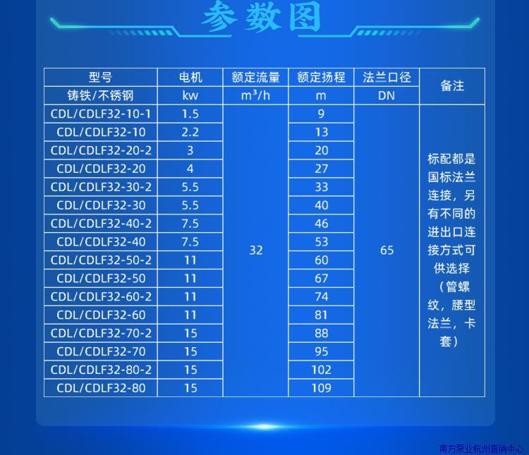 南方泵业CDL/CDLF系列轻型立式多级离心泵,外形美观、结构紧凑、维护方便,适用于从自来水到工业液体的多种介质输送。CDL系列适用于无腐蚀性液体,CDLF系列适用于轻度腐蚀性液体,具有节能、低噪音、经久耐用、环保及运行稳定等优点。 该泵广泛应用于水厂过滤与输送、高层建筑二次供水、工业流程增压、清洗系统、消防系统、冷却循环、锅炉给水、酸碱输送、农田灌溉、喷滴灌系统以及反渗透、超滤等水处理系统。 产品采用不锈钢泵体,配备全封闭风冷式二级电机,防护等级IP55,绝缘等级F级,适应常温至120℃热水型工况,环境温度最高达40℃,海拔不超过1000米。提供多种流量、扬程和功率型号(如CDL32-10至CDL32-160),法兰连接为国标配置,亦可选配管螺纹、腰型法兰或卡套连接。 我们提供原厂正品保障,一年质保,专业客服支持,闪电发货,全国联保服务。如遇安装使用问题,可随时联系在线客服获取技术支持,确保客户使用无忧。
