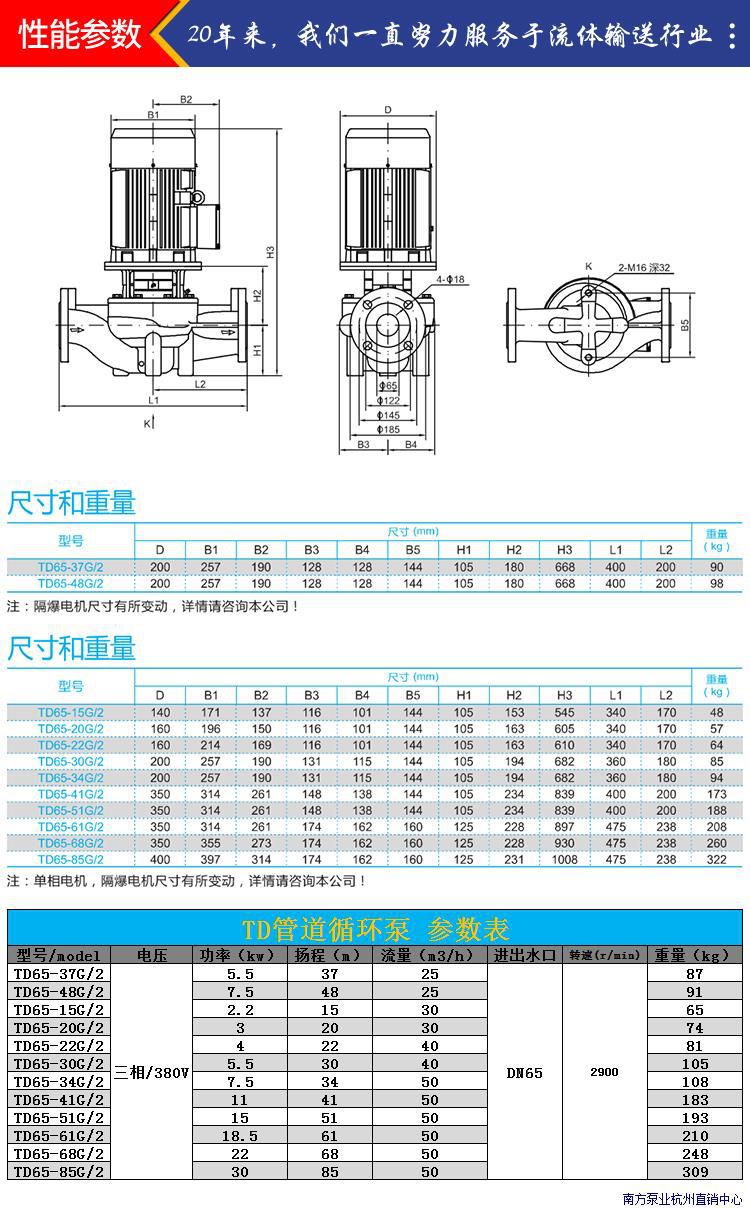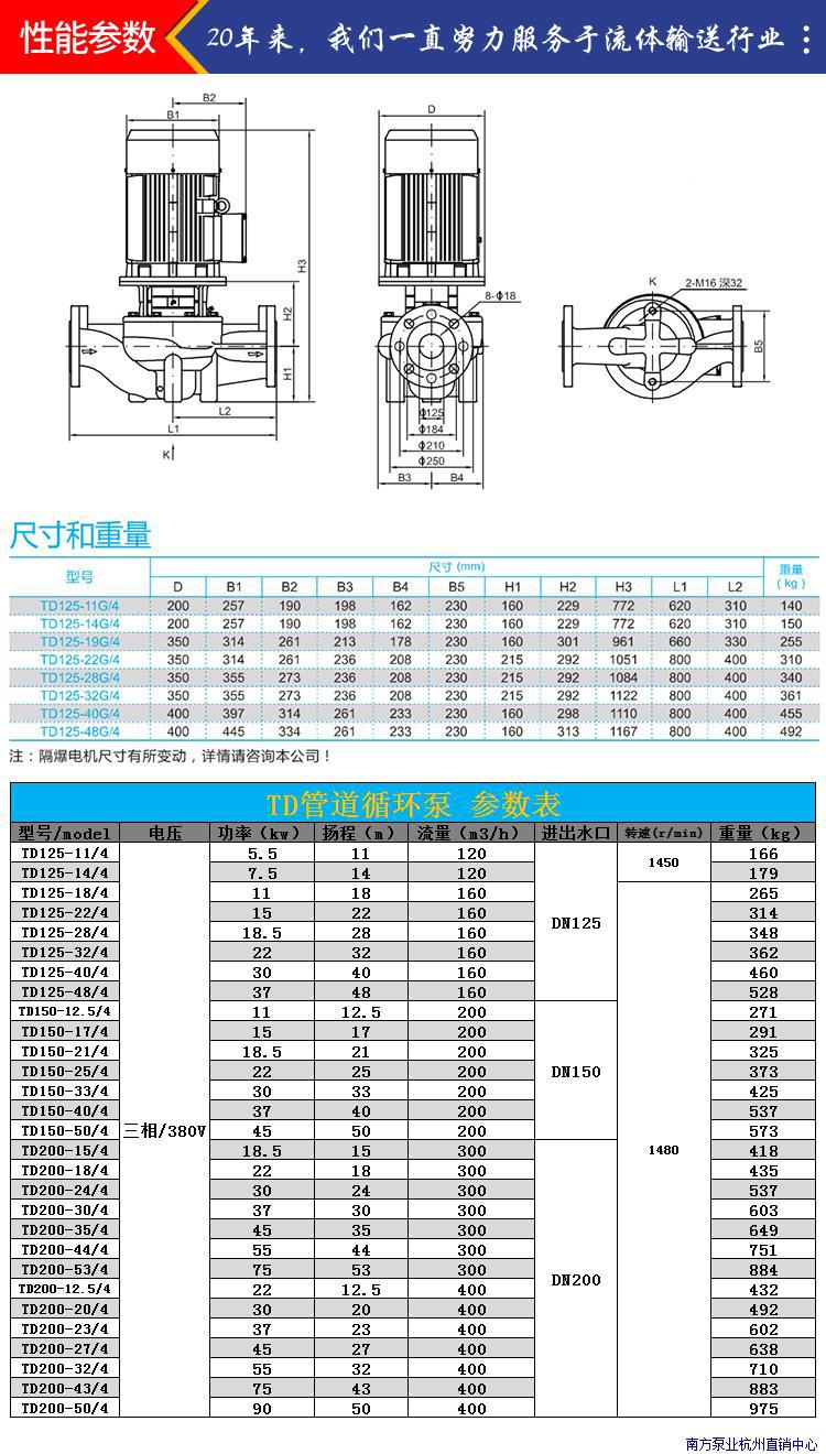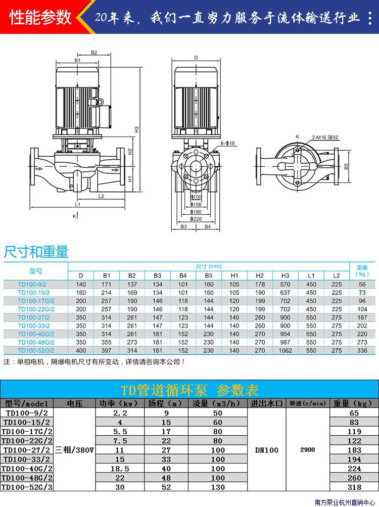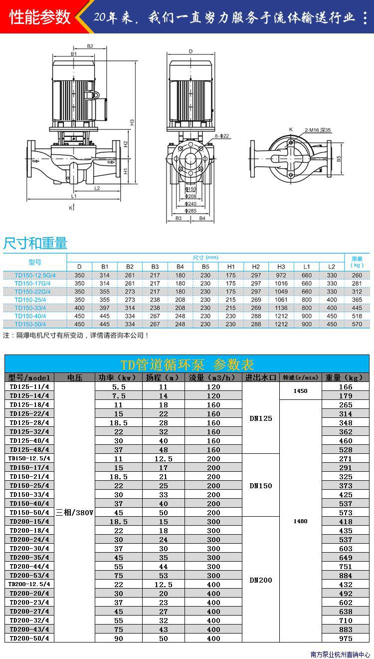 川源LD(TD)系列管道循环泵,外形美观、结构紧凑、维护方便,广泛应用于工业、建筑、水处理及暖通空调系统的液体循环。产品采用高性能电机,运行稳定,效率高,具备坚固耐用的特点。 该系列涵盖TD32、TD40、TD50多个型号,流量范围广,扬程从12米至80米,功率覆盖0.75kW至22kW,满足不同工况需求。进出水口分别为DN32、DN40、DN50,适配性强,安装便捷。 所有型号均支持2900r/min标准转速,电压可选380V或220V/380V双电压配置,部分型号支持单相及隔爆电机定制(需咨询)。泵体尺寸设计合理,节省空间,适合管道直连安装。 详细尺寸与重量数据齐全,便于工程设计与选型。如需获取单相或防爆电机版本的特殊尺寸,请联系厂家技术支持。