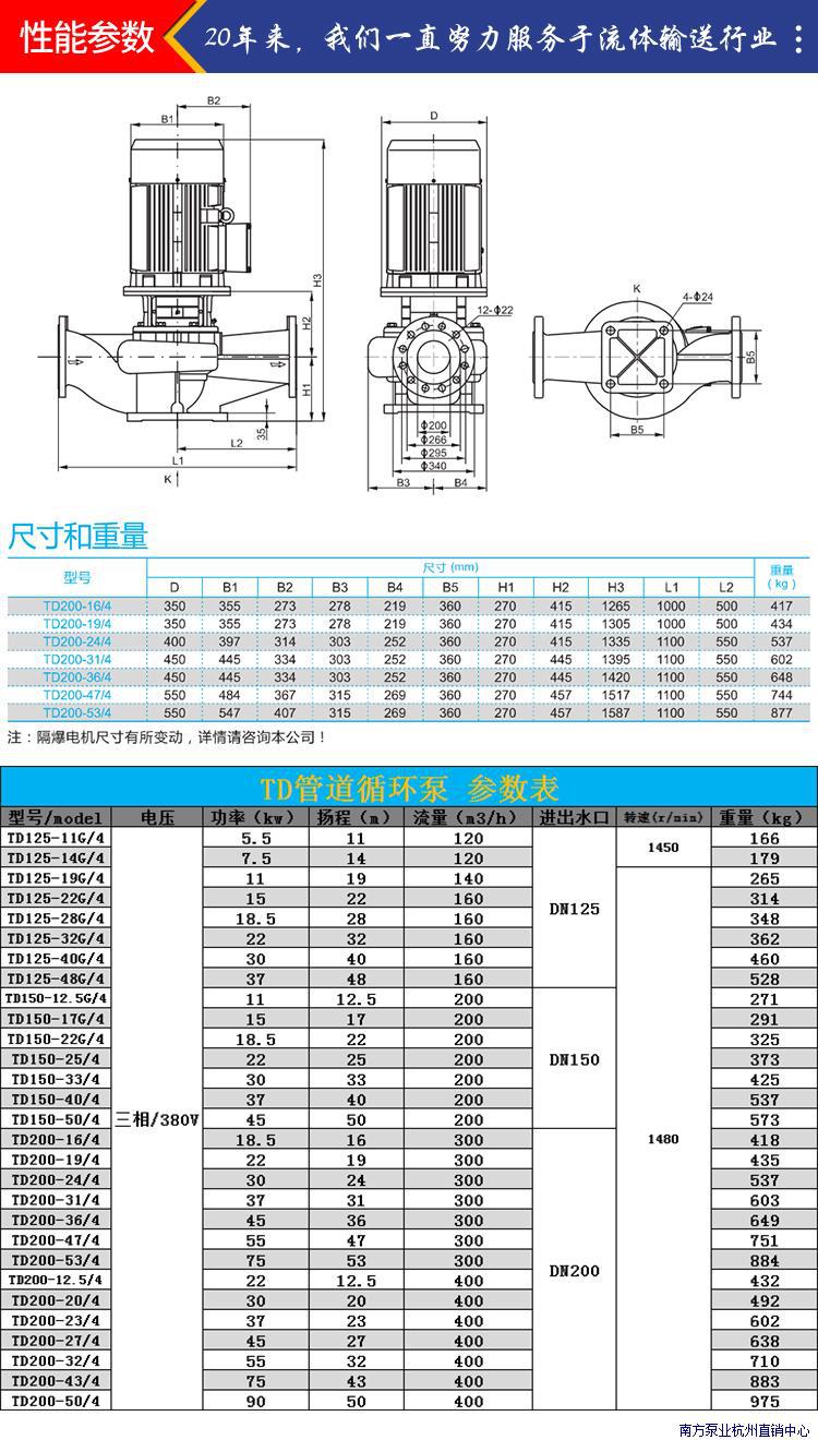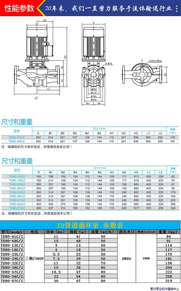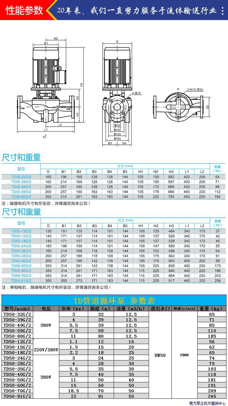 川源LD(TD)系列管道循环泵,外形美观、结构紧凑、维护方便,广泛应用于工业、建筑、水处理及暖通空调系统的液体循环。产品采用高性能电机,运行稳定,效率高,具备坚固耐用的特点。 该系列涵盖TD32、TD40、TD50多个型号,流量范围广,扬程从12米至80米,功率覆盖0.75kW至22kW,满足不同工况需求。进出水口分别为DN32、DN40、DN50,适配性强,安装便捷。 所有型号均支持2900r/min标准转速,电压可选380V或220V/380V双电压配置,部分型号支持单相及隔爆电机定制(需咨询)。泵体尺寸设计合理,节省空间,适合管道直连安装。 详细尺寸与重量数据齐全,便于工程设计与选型。如需获取单相或防爆电机版本的特殊尺寸,请联系厂家技术支持。