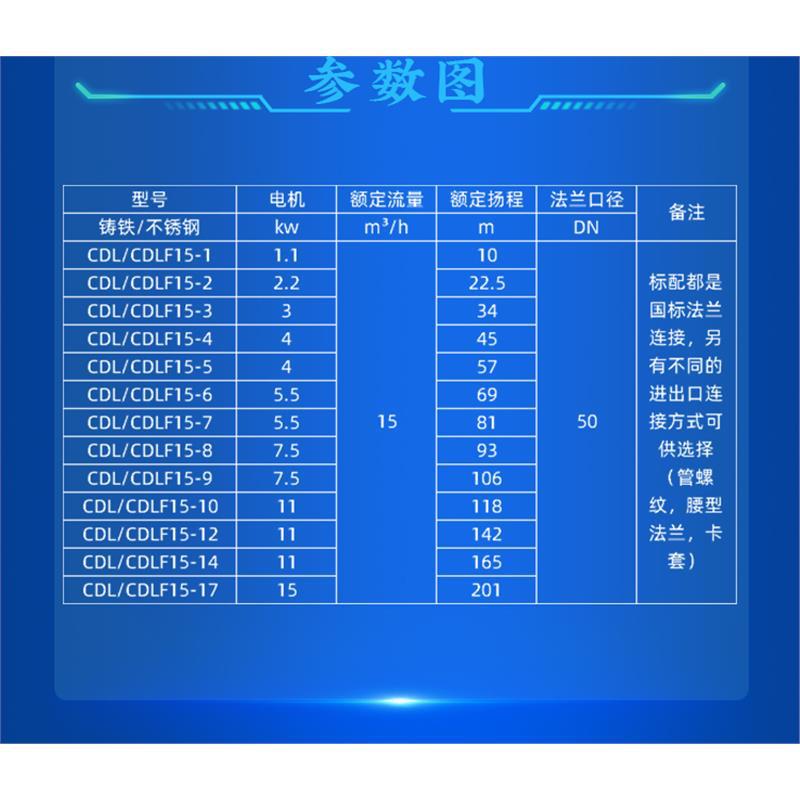 南方泵业CDL/CDLF系列轻型立式多级离心泵,外形美观、结构紧凑、维护方便,广泛应用于从自来水到工业液体的多种介质输送。其中CDL适用于无腐蚀性液体,CDLF适用于轻度腐蚀性液体。产品具备节能、低噪音、运行稳定、经久耐用等优点,适用于供水系统、工业增压、冷却循环、锅炉给水、水处理(反渗透、超滤)、农田灌溉等领域。电机防护等级IP55,绝缘等级F级,支持多种电压配置,适应不同工况需求。提供多种法兰或螺纹连接方式,安装便捷。杭州直销中心支持闪电发货,全国联保,专业客服全程技术支持,整机一年质保(易损件除外),确保用户使用无忧。