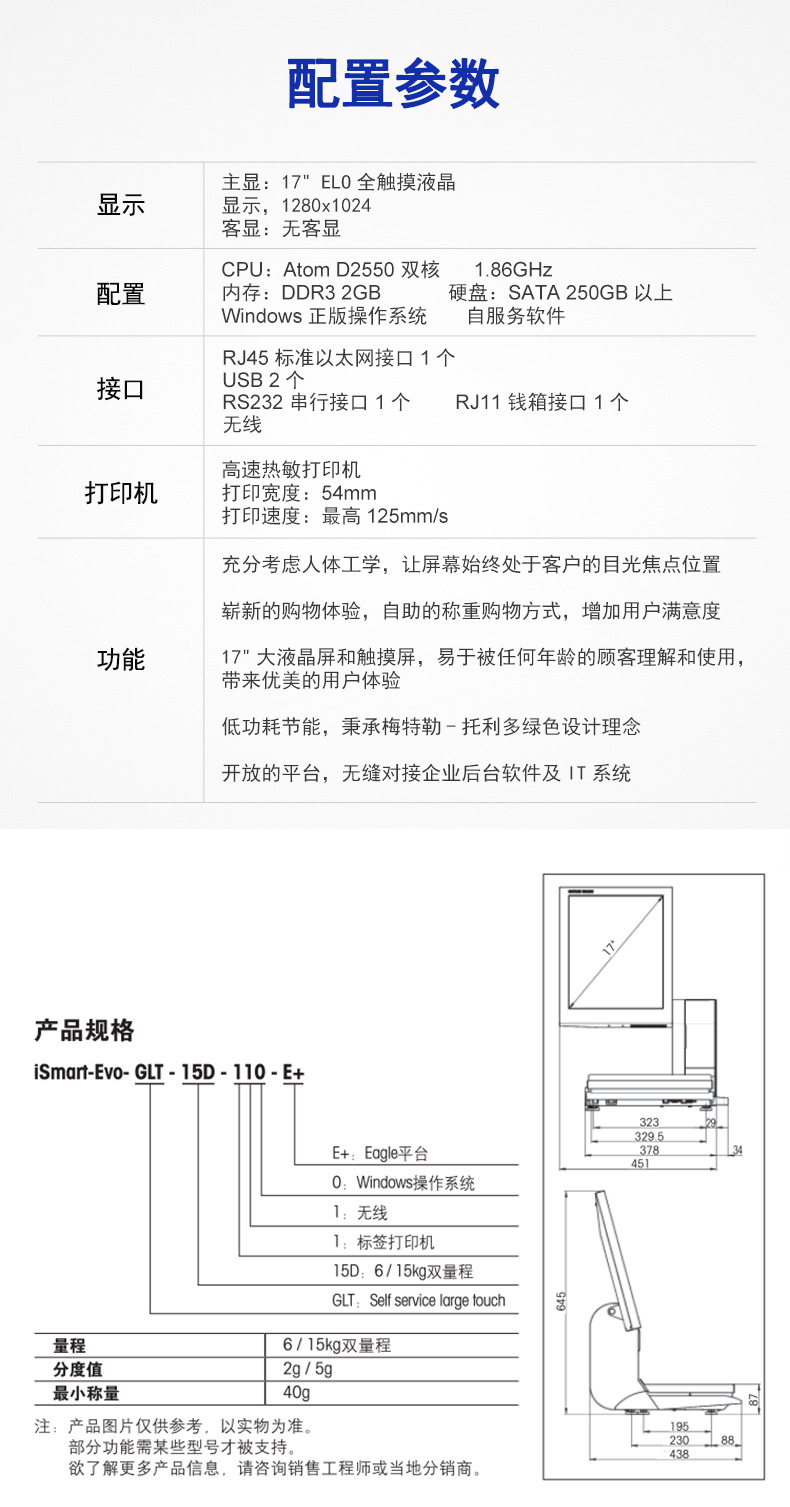 梅特勒托利多(METTLER TOLEDO)iSmart-Evo自助服务秤是一款专为现代零售环境设计的高性能称重设备。采用17英寸ELO全触摸液晶显示屏,分辨率达1280x1024,支持多角度调节,确保不同身高的用户都能获得舒适的操作视野。设备搭载Atom双核处理器,运行稳定流畅,支持Windows正版操作系统及自服务软件,可无缝对接企业后台系统。 该自助秤配备高速热敏打印机,打印宽度54mm,最高速度达125mm/s,显著减少顾客等待时间。基座采用金属铝压铸与亚光处理工艺,坚固耐刮、易于清洁,配合无风扇散热设计,有效防尘防虫,保障食品安全卫生。 适用于超市生鲜区、预包装商品区、连锁专卖店等需要自助称重的场景,帮助商家降低人力成本,提升顾客满意度。支持无线连接、多种接口扩展,具备6/15kg双量程配置,分度值2g/5g,最小称量40g,满足多样化称重需求。 iSmart-Evo系列秉承绿色节能理念,低功耗运行,助力可持续发展。是现代化智慧零售不可或缺的智能称重终端。