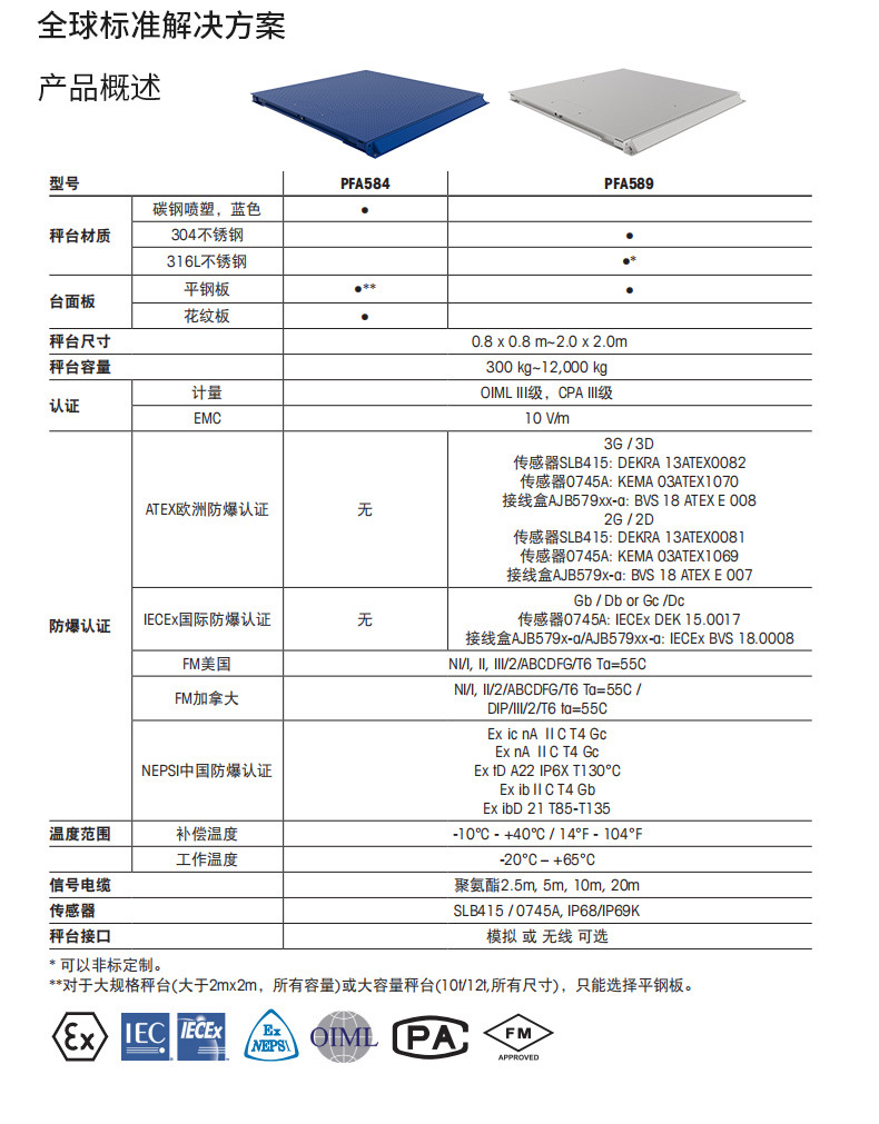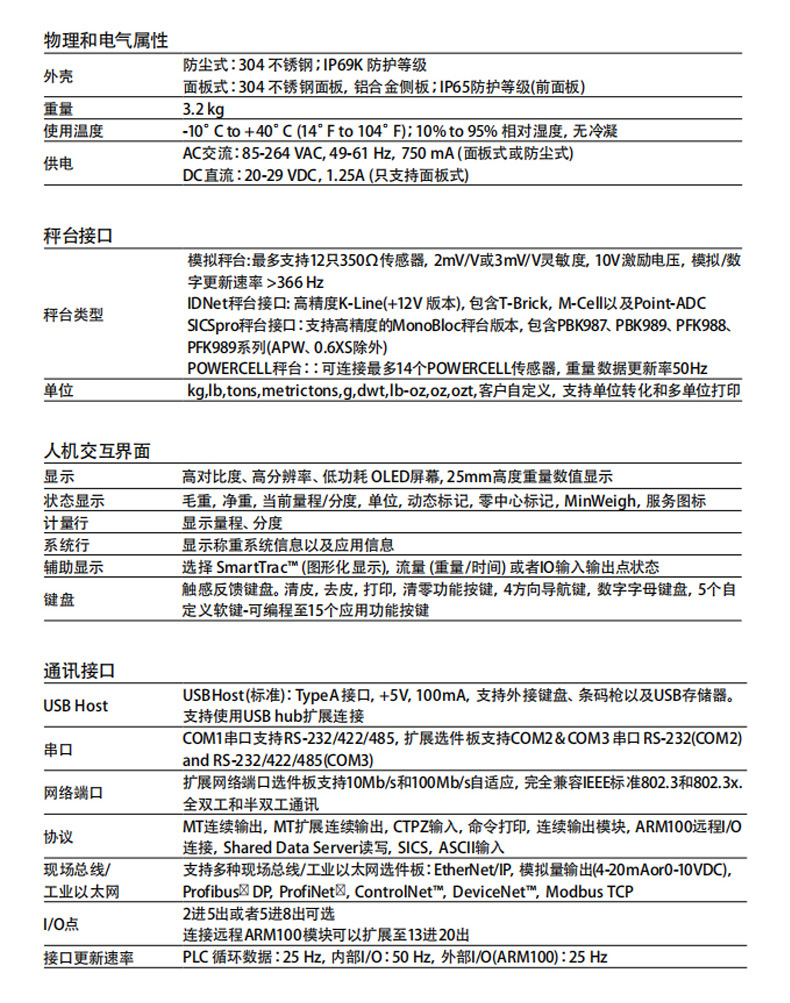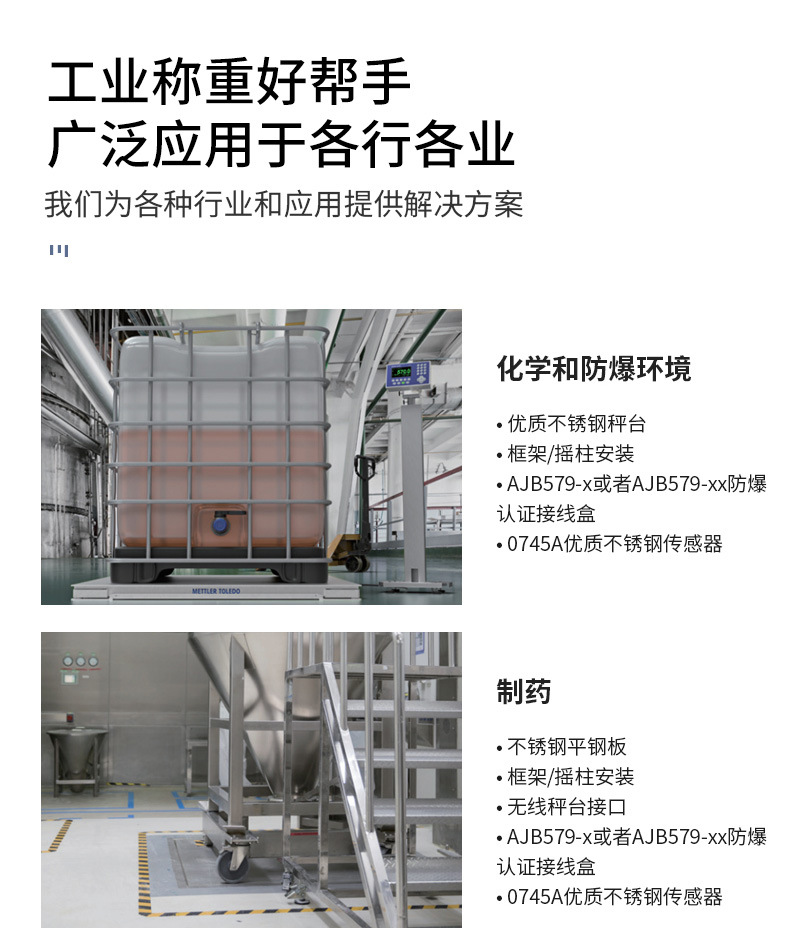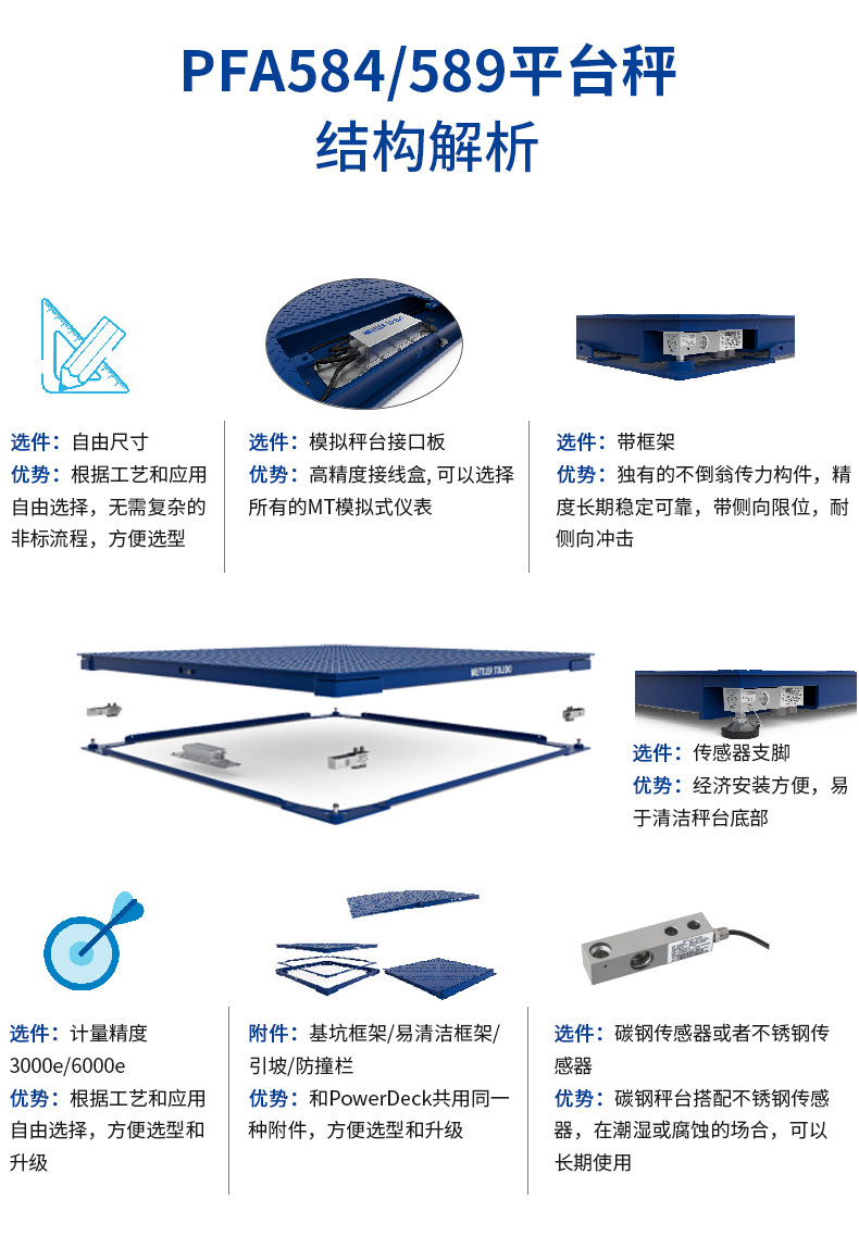 梅特勒托利多(METTLER TOLEDO)PFA584/589平台秤是一款可靠且经济高效的工业称重设备,广泛应用于化学、制药、食品和一般制造业等领域。产品采用模块化设计,具备全球认证,支持灵活配置,满足不同行业对精度、安全与耐用性的严苛要求。 核心优势包括: - 模块化配置,轻松实现统一高效管理; - 支持长期运行与可升级方案,适应未来需求变化; - 提供碳钢、304及316L不锈钢秤台选项,适用于腐蚀性或高清洁环境; - 可选防爆认证组件(ATEX、IECEx、FM等),适用于危险区域; - 搭载0745A不锈钢传感器或SLB415合金钢传感器,确保长期稳定性; - 支持模拟或无线秤台接口,便于集成到现有系统; - 独有的不倒翁传力构件设计,抗侧向冲击,保障称重精度; - 多种附件可选,如引坡、基坑框架、易清洁框架、防护栏等,提升使用便利性与安全性。 技术参数覆盖最大秤量300kg至12,000kg,检定分度值达6000e,适用于高精度称重场景。同时兼容IND245、IND570等多种仪表,实现自由搭配,满足贸易结算与工业控制需求。 无论是潮湿、腐蚀还是高强度作业环境,PFA584/589平台秤均能提供扎实可靠的称重性能,是企业提升生产效率与质量控制的理想选择。