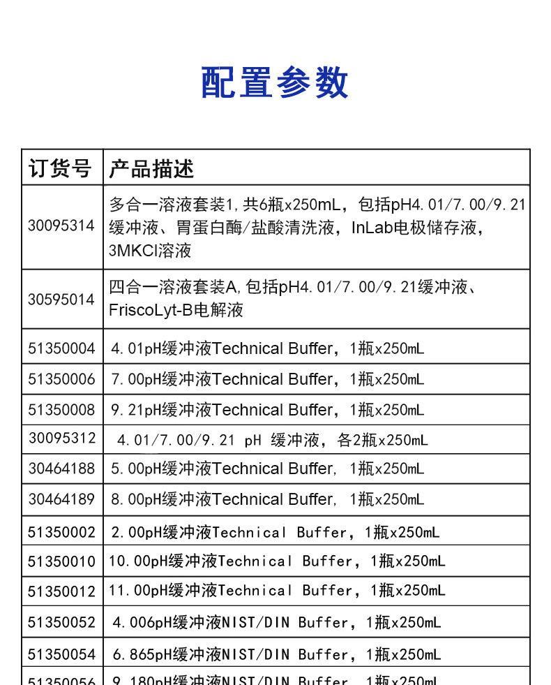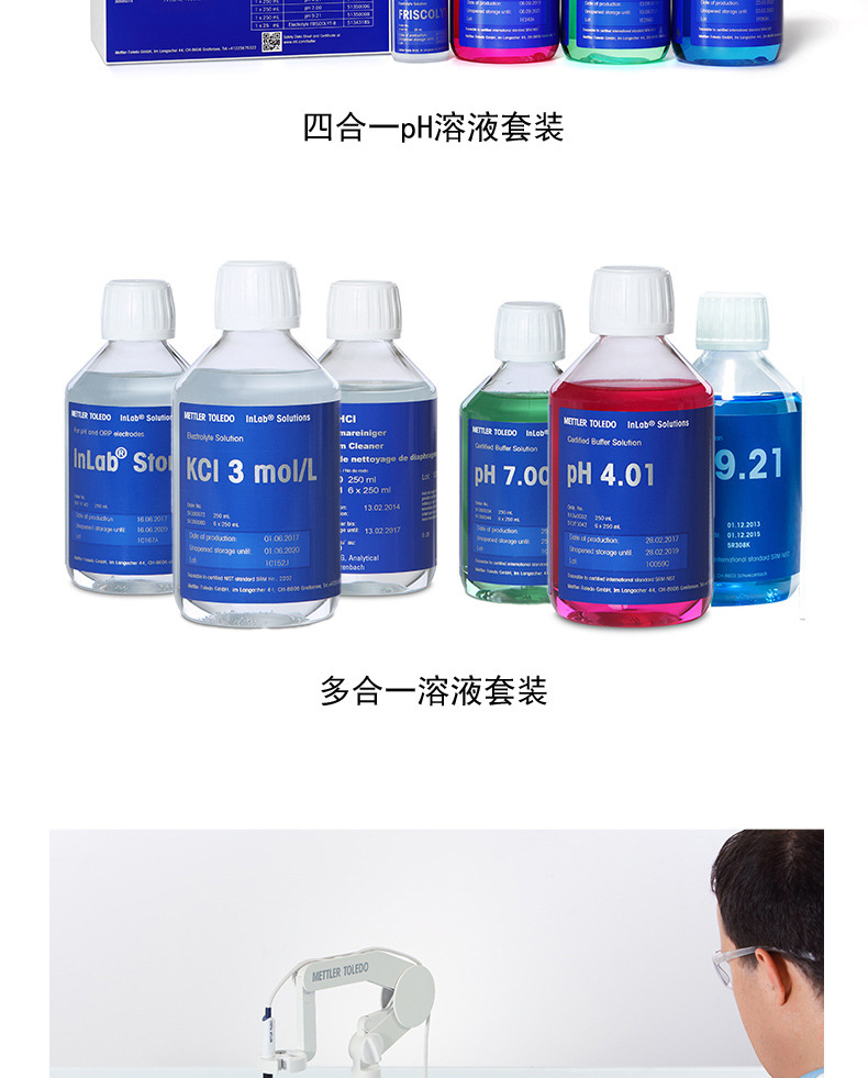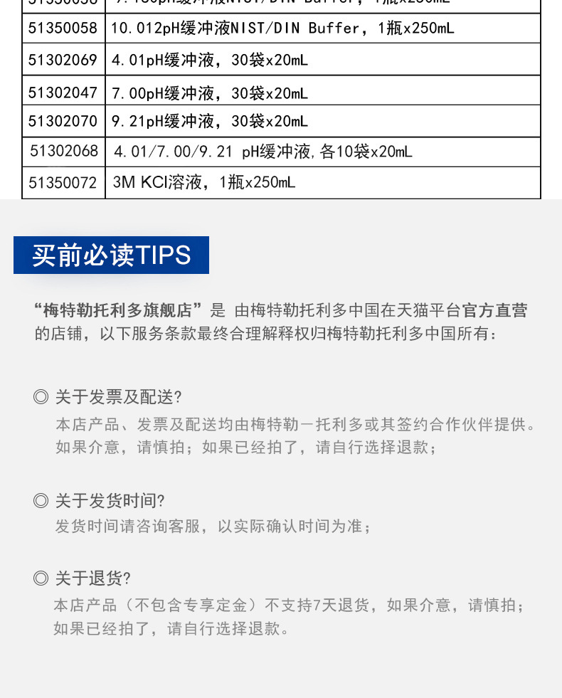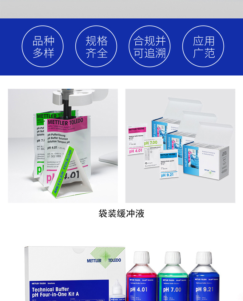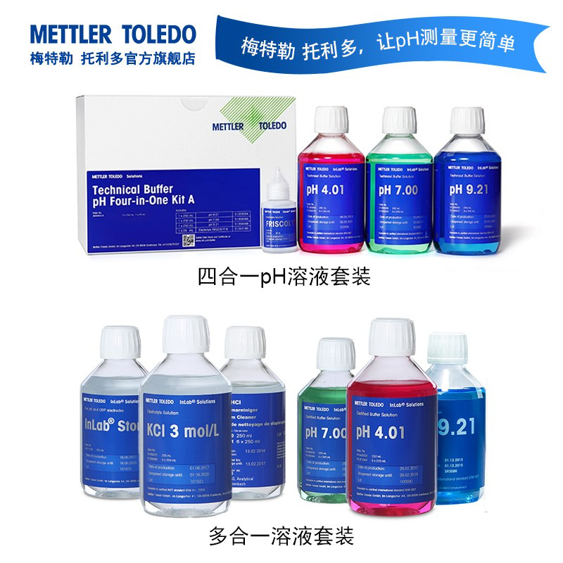 METTLER TOLEDO(梅特勒托利多)是源自瑞士的百年品牌,全球领先的精密仪器与实验室解决方案供应商。本店提供原装正品pH缓冲液套装,涵盖多种规格与组合,满足不同场景下的校准与验证需求。 产品特点: - 高精度校准:pH 4.01、7.00、9.21等标准点精准稳定,确保测量可靠性。 - 多种套装选择:包括四合一、多合一组合套装,集成缓冲液、清洗液、电极储存液及3mol/L KCl溶液,使用便捷。 - NIST/DIN标准支持:部分型号依据DIN/ISO 19266生产,精度达小数点后三位(如pH 9.180),附带详细检测证书,实现全程可追溯。 - 广泛应用:适用于制药、食品饮料、环境监测、农业、科研院校等多个领域的实验室及现场操作。 - 包装多样:提供瓶装(250mL)和袋装(20mL×30)两种形式,便于携带与长期保存。 主要产品型号: - 四合一溶液套装A:含pH 4.01/7.00/9.21缓冲液及FriscoLyt-B电解液 - 多合一溶液套装1:含缓冲液、胃蛋白酶清洗液、InLab储存液、3mol/L KCl等6瓶组合 - 单瓶/袋装缓冲液:覆盖pH 2.00至11.00全范围,支持Technical Buffer与NIST/DIN Buffer系列 温馨提示:本产品为官方直营保障,发货周期可能因库存调配最长达3个月,请保持联系方式畅通以便确认发货时间。不支持7天无理由退货,下单前请咨询客服确认需求。