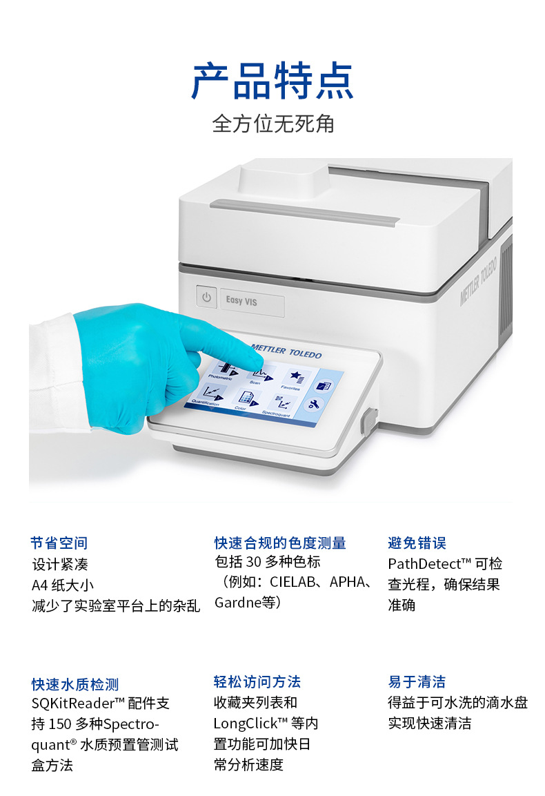 梅特勒托利多EasyPlus系列紫外/可见分光光度计是一款专为常规光谱分析设计的高效仪器,广泛应用于水质检测、色度测量等领域。产品配备SQKitReader™配件,支持超过150种Spectro-quant®预置管测试方法,显著提升检测效率。内置PathDetect™技术,兼容多种国际色标标准(如CIELAB、APHA、Gardner等),实现全方位无死角测量。设备设计紧凑,仅需A4纸大小空间,适合各类实验室环境。配备可水洗滴水盘,清洁便捷;收藏夹列表与LongClick™功能助力日常分析更快速流畅。本系列产品提供可靠的测量结果,简化工作流程,确保数据准确、可重复,是实验室常规检测的理想选择。请注意:本店产品由梅特勒托利多签约合作伙伴负责发货、发票及售后服务,购买前请咨询客服确认配送区域与库存情况,不支持7天无理由退货。