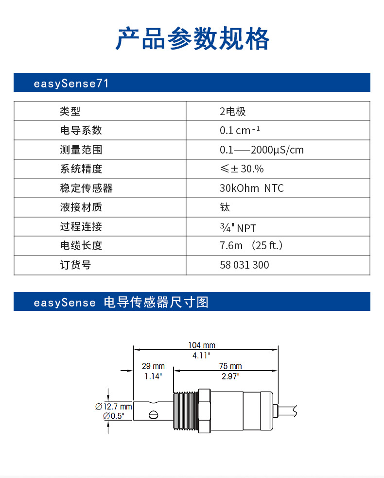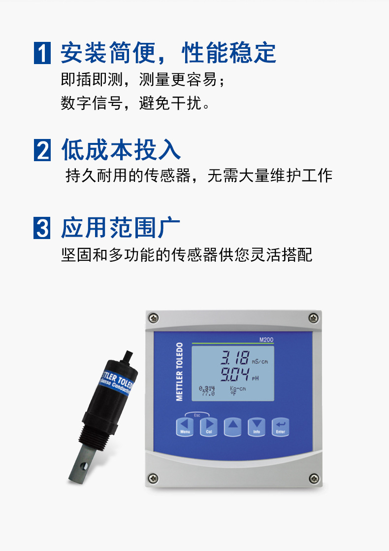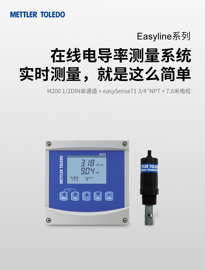 梅特勒托利多(METTLER TOLEDO)Easyline系列在线电导率测量系统,专为实时、稳定、精准的电导率监测设计。本产品组合包含M2001/2DIN单通道变送器与easySense713电导传感器(4"NPT连接,7.6米电缆),即插即测,操作简便。 ● 安装便捷,性能稳定:采用数字信号传输,有效避免干扰,确保测量准确可靠; ● 低成本高耐用:传感器结构坚固,维护需求低,长期使用更经济; ● 应用广泛:适用于污水处理等多种工业场景,搭配灵活,适应性强。 easySense713传感器参数: - 类型:2电极 - 电导系数:0.1 cm⁻¹ - 测量范围:0.1–2000 μS/cm - 系统精度:≤±3% - 温度传感器:30kOhm NTC - 液接材质:钛(耐腐蚀) - 过程连接:¼" NPT - 电缆长度:7.6米(25英尺) - 订货号:58031300 适用于对水质监控要求较高的工业过程控制领域。购买即享梅特勒托利多全国售后服务支持,详情请咨询客服。