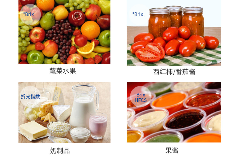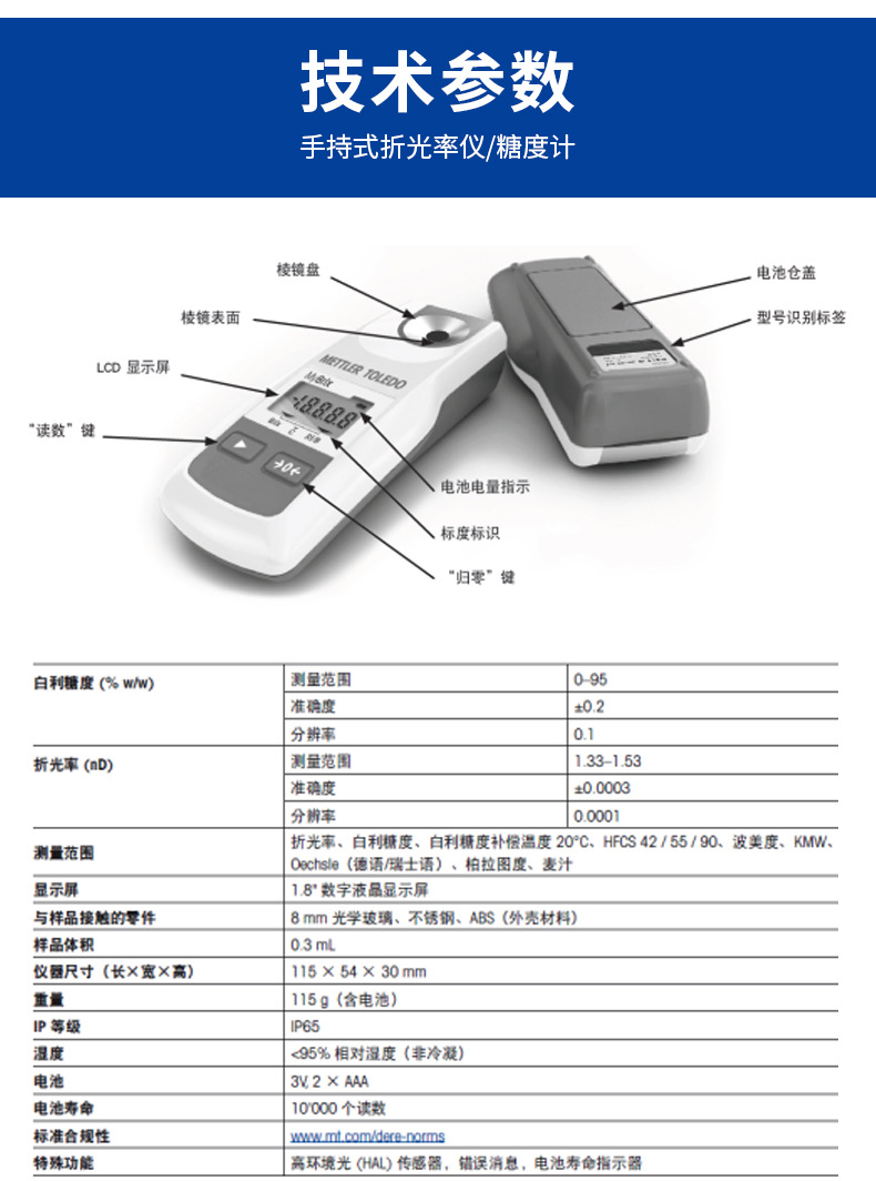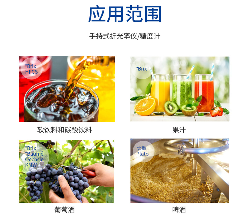 梅特勒托利多(METTLER TOLEDO)MyBrix手持式折光率仪/糖度计是一款专为食品与饮料行业设计的便携式检测设备。该仪器具备0-95°Brix宽测量范围,分辨率达0.1°Brix,准确度±0.2°Brix,并支持折光率(nD)、HFCS(高果糖玉米糖浆)、波美度、KMW、Oechsle、柏拉图度等多种测量标度,满足多样化应用场景需求。 产品采用坚固耐用设计,符合IP65防护等级,配备橡胶键盘和浅棱镜盘,便于户外、生产线或实验室使用。仅需0.3mL样品即可实现快速测量,内置自动温度补偿(ATC)功能,确保不同环境下的测量稳定性。支持10,000次以上读数的长续航电池,轻巧便携(115g含电池),适合现场质量控制。 广泛应用于果汁、软饮料、啤酒、葡萄酒、奶制品、果酱、蔬菜水果等产品的糖度与浓度检测,是食品饮料行业过程监控与品质管理的理想工具。