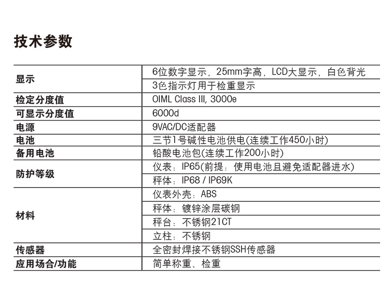 该台秤采用低功耗设计,支持三节一号碱性电池供电,可持续工作达450小时;亦可选配铅酸电池包,充电后连续使用200小时,满足长时间作业需求。仪表防护等级达IP65(使用电池时),秤体防护等级高达IP68/IP69K,具备卓越的防水、防尘、防腐蚀性能。