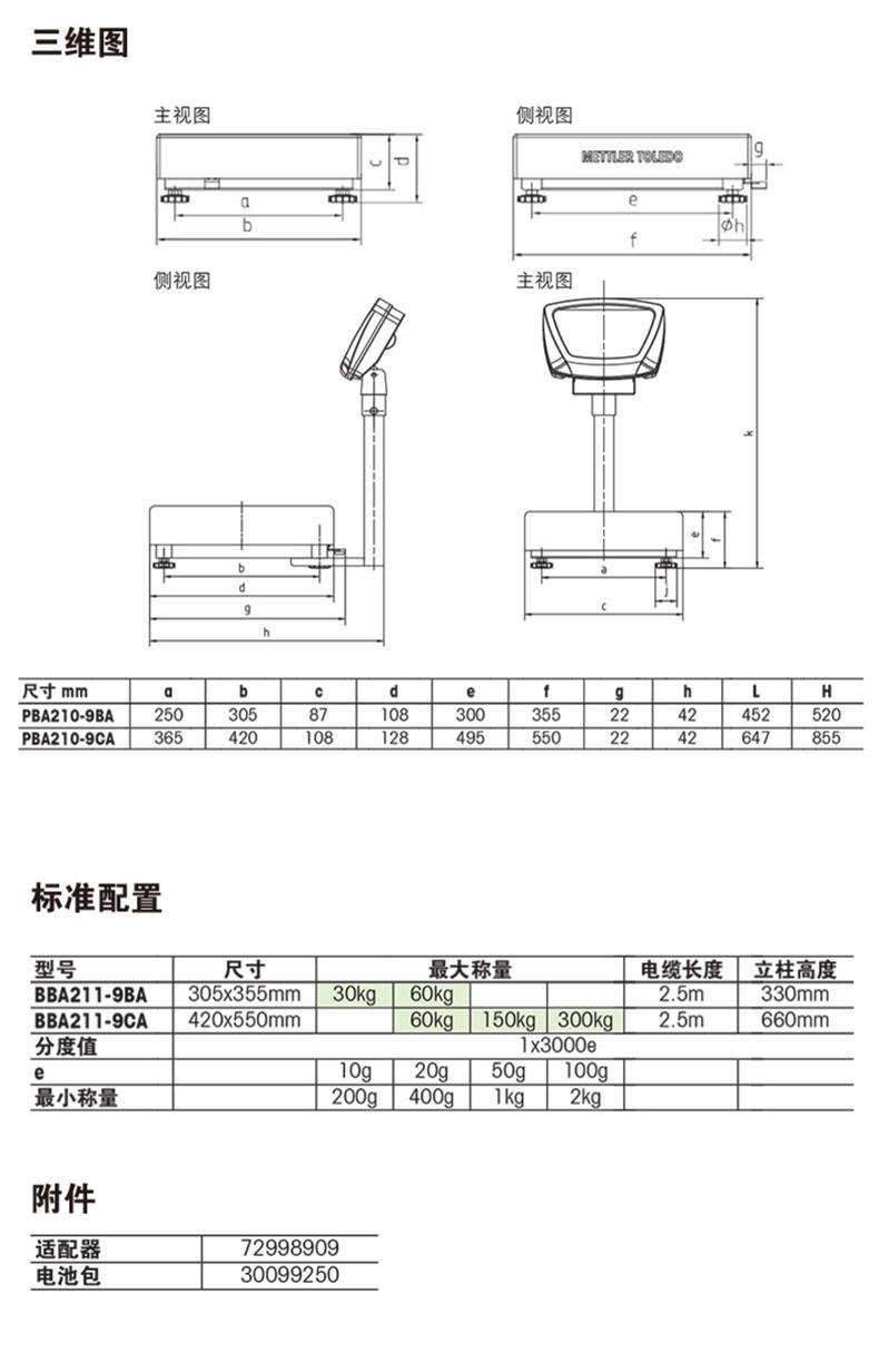 产品提供多种规格型号(BBA211-9BA / BBA211-9CA),最大称量覆盖30kg至300kg,分度值精细,满足不同精度需求。标准配置包括2.5米信号电缆和可调立柱高度,便于现场安装与操作。