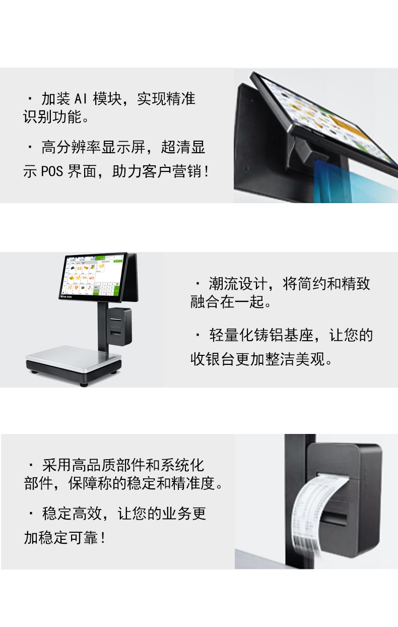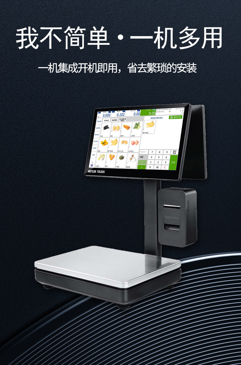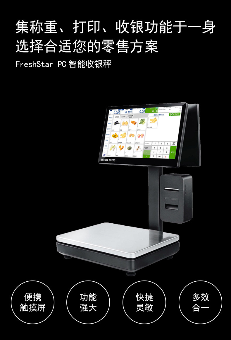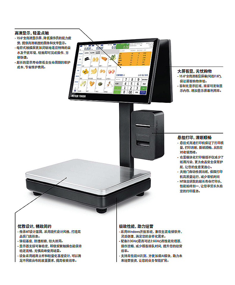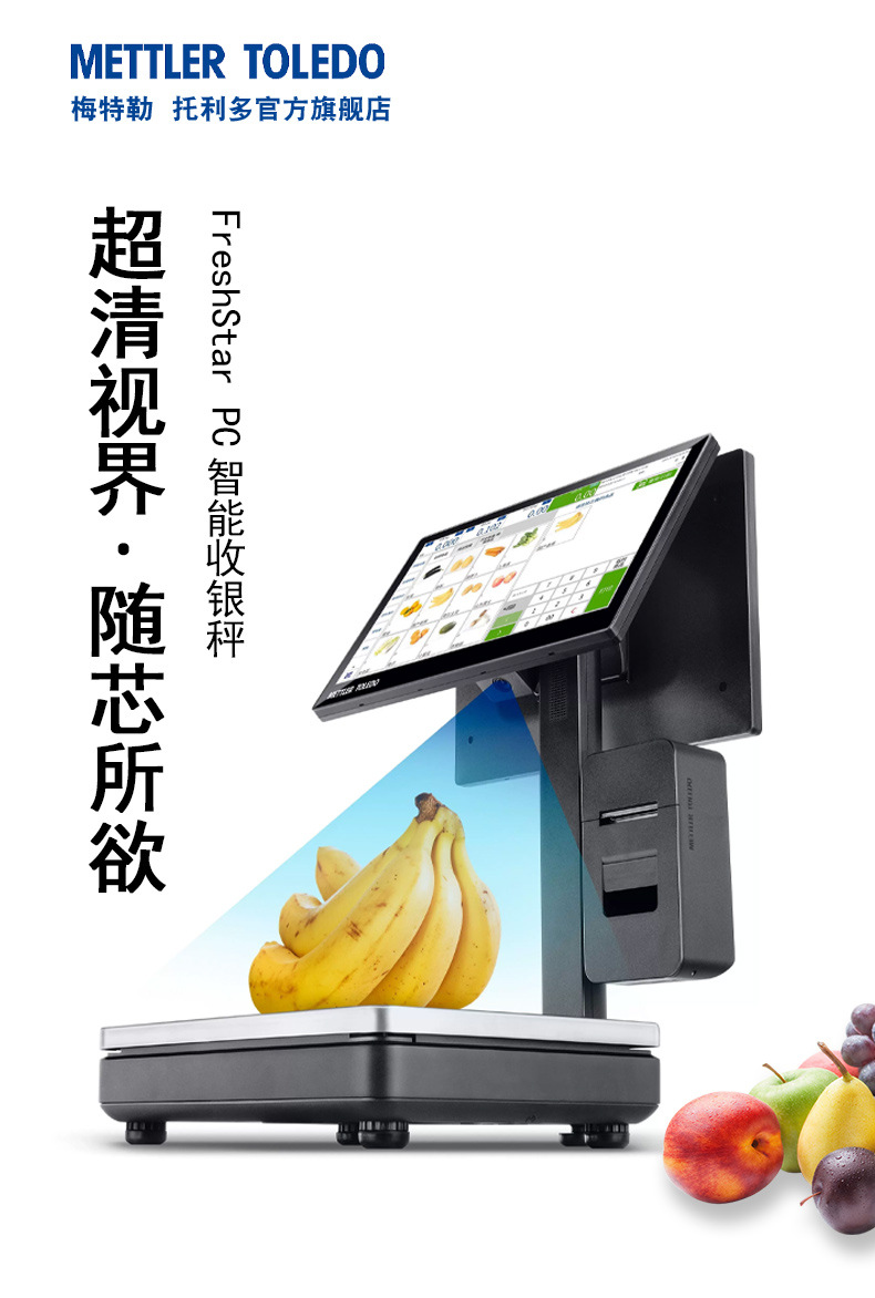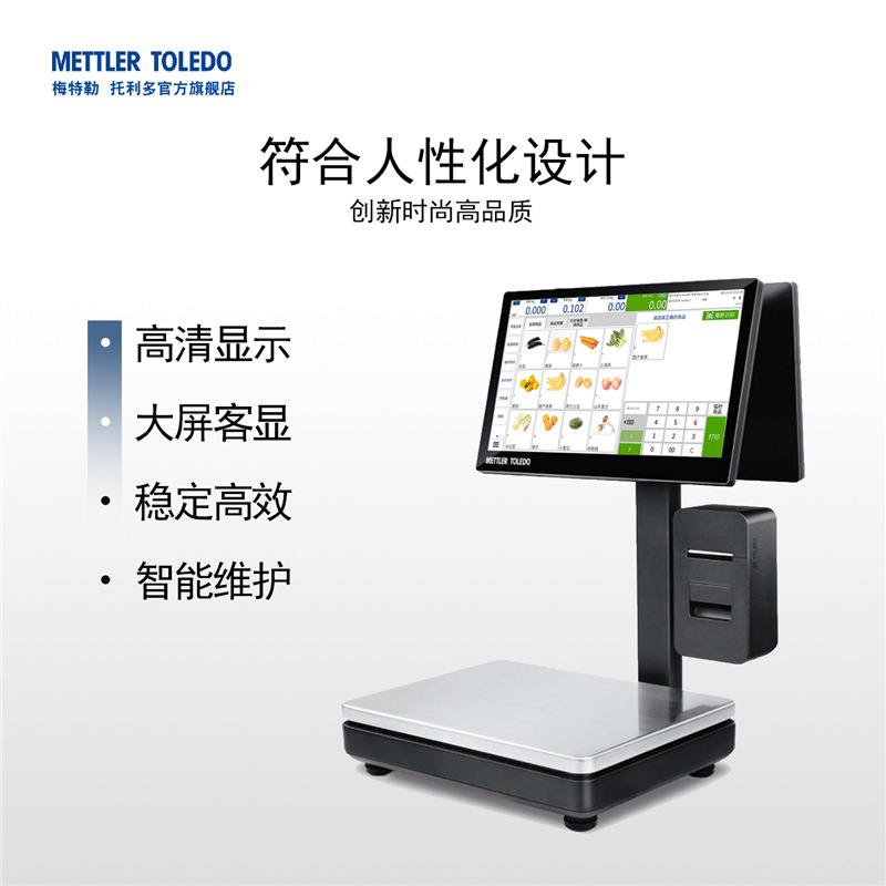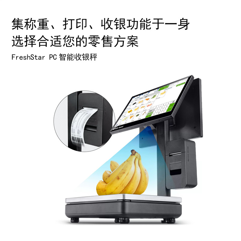 梅特勒托利多FreshStar PC智能收银秤是一款集称重、收银、打印于一体的高性能智能设备。采用Windows开放系统,兼容主流收银软件,搭载2.0GHz高性能处理器,操作流畅,提升门店运营效率。配备15.6英寸全高清电容式触摸屏和客显屏幕(可选11.6英寸),显示清晰,触控灵敏,降低操作疲劳。内置高速热敏打印机,支持自动出纸检测与悬挂安装,打印清晰、撕纸顺畅,保障高峰时段稳定运行。支持加装AI模块,实现商品精准识别,助力未来智能化升级。轻量化铸铝基座设计,美观耐用,适用于水果、生鲜、熟食及休闲食品等零售场景。提供多种配置套餐,搭配会员管理、库存管理、多语言支持、双屏显示等丰富软件功能,满足连锁门店多样化需求。享受正品保障、365天免费保修及终身技术支持,是高品质零售门店的理想选择。