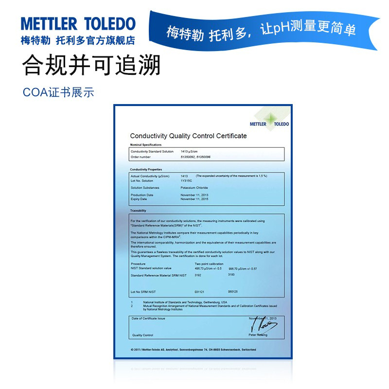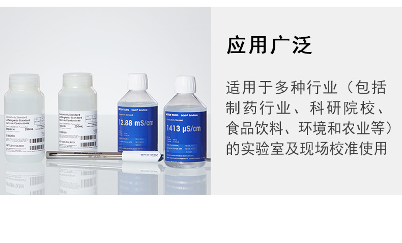 梅特勒托利多(METTLER TOLEDO)是百年瑞士品牌,全球领先的精密仪器与衡器制造商。其电导率标准溶液专为高精度校准设计,广泛应用于制药、科研、食品饮料、环境监测和农业等领域。 产品特点: - 多种规格可选:84 μS/cm、1413 μS/cm、12.88 mS/cm,满足不同校准需求; - 包装便捷耐用,标签清晰,部分为袋装设计,便于现场使用; - 所有标准液均可追溯至NIST或CSRM等国际标准,确保合规性与准确性; - 每批产品附带测试证书,符合法规要求,适用于GMP、GLP等质量管理体系; - 建议每次校准时使用新鲜溶液,提升测量可靠性。 适用场景:实验室pH/电导仪校准、在线监测设备标定、质量控制与认证等。 温馨提示:本产品由梅特勒托利多中国官方旗舰店销售,发货及服务由授权合作伙伴提供,不支持7天无理由退货,请购买前联系客服确认配送区域与库存情况。