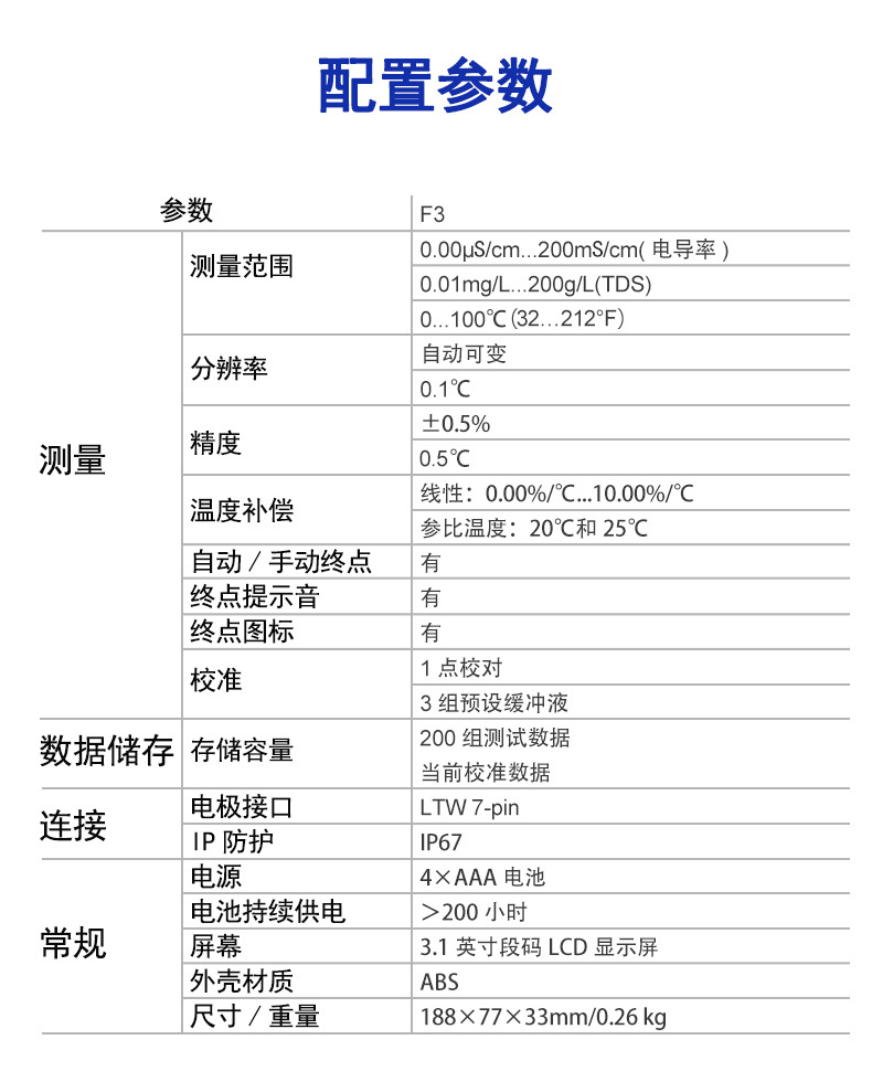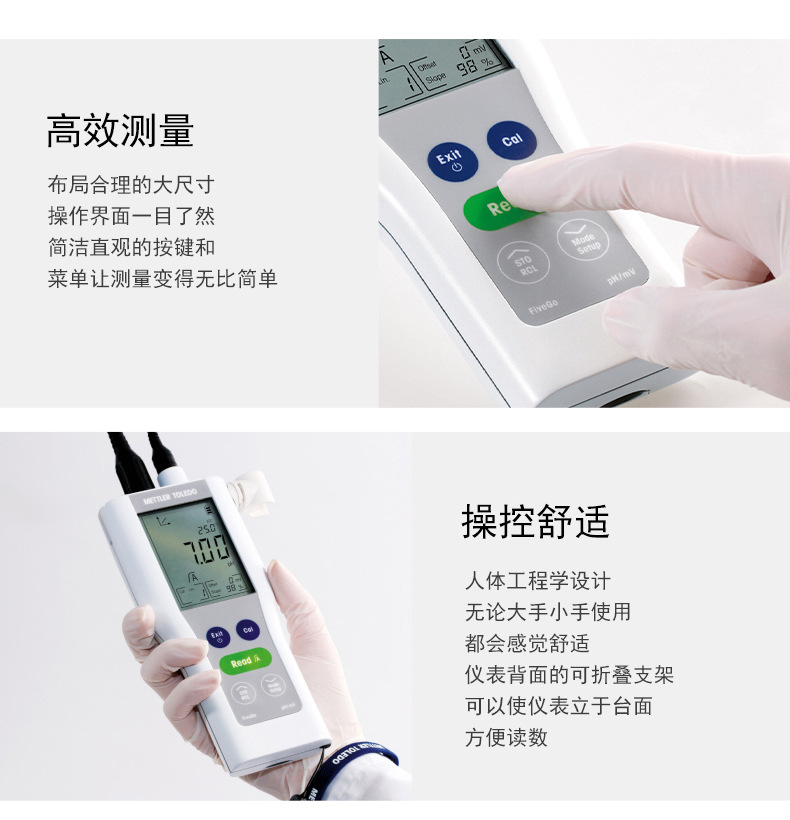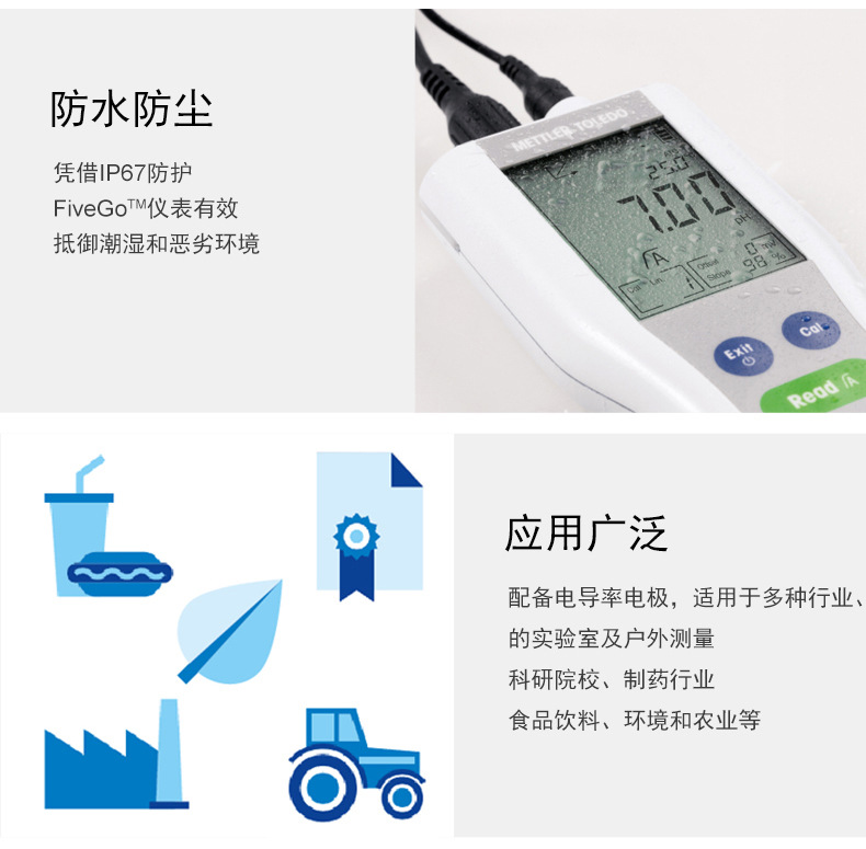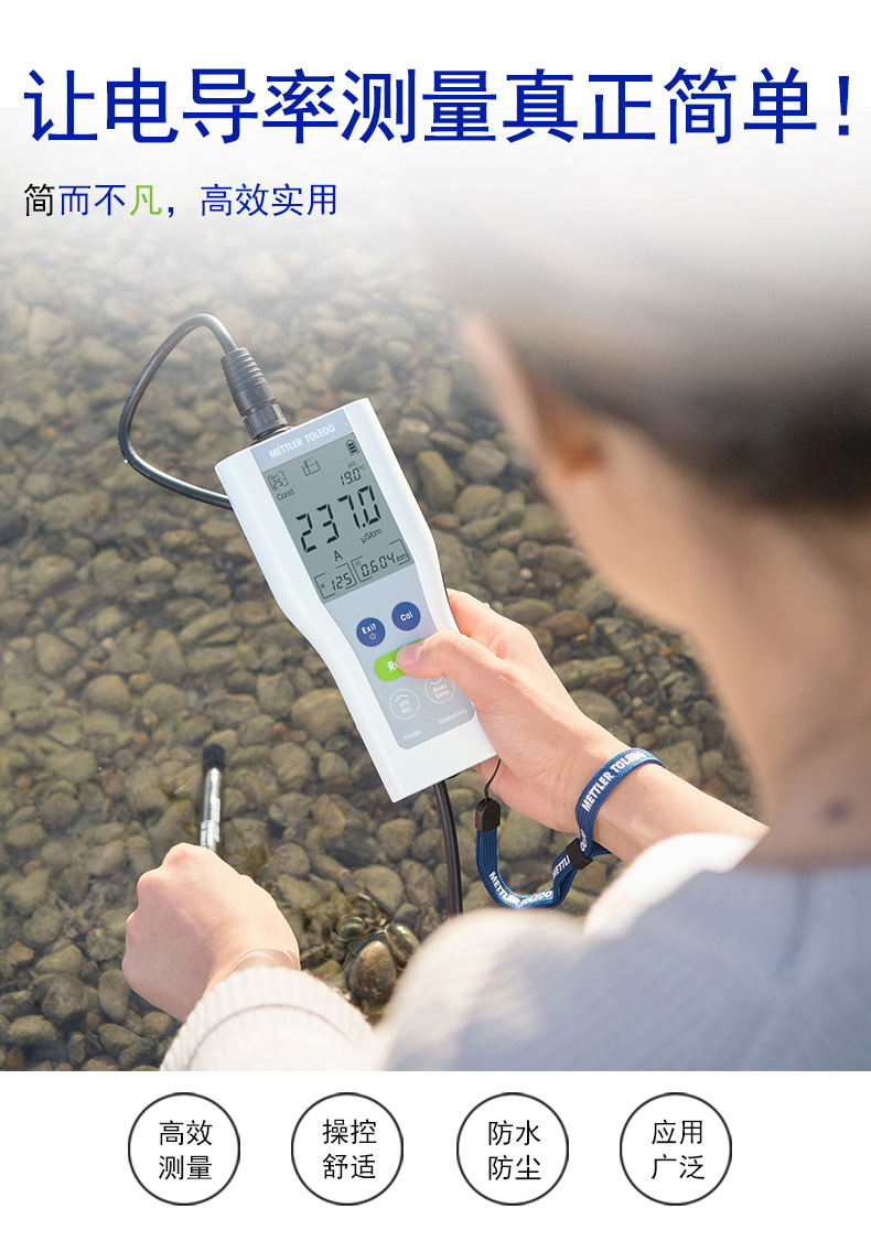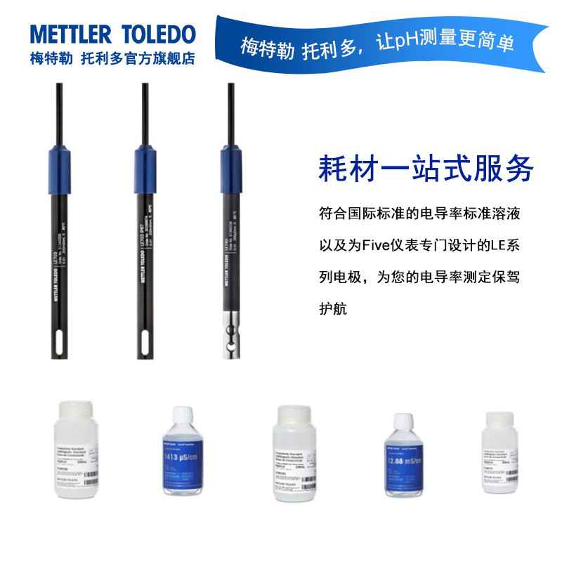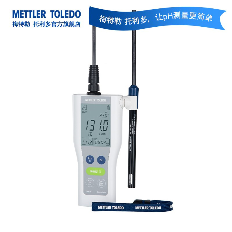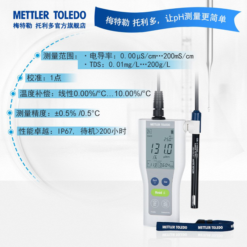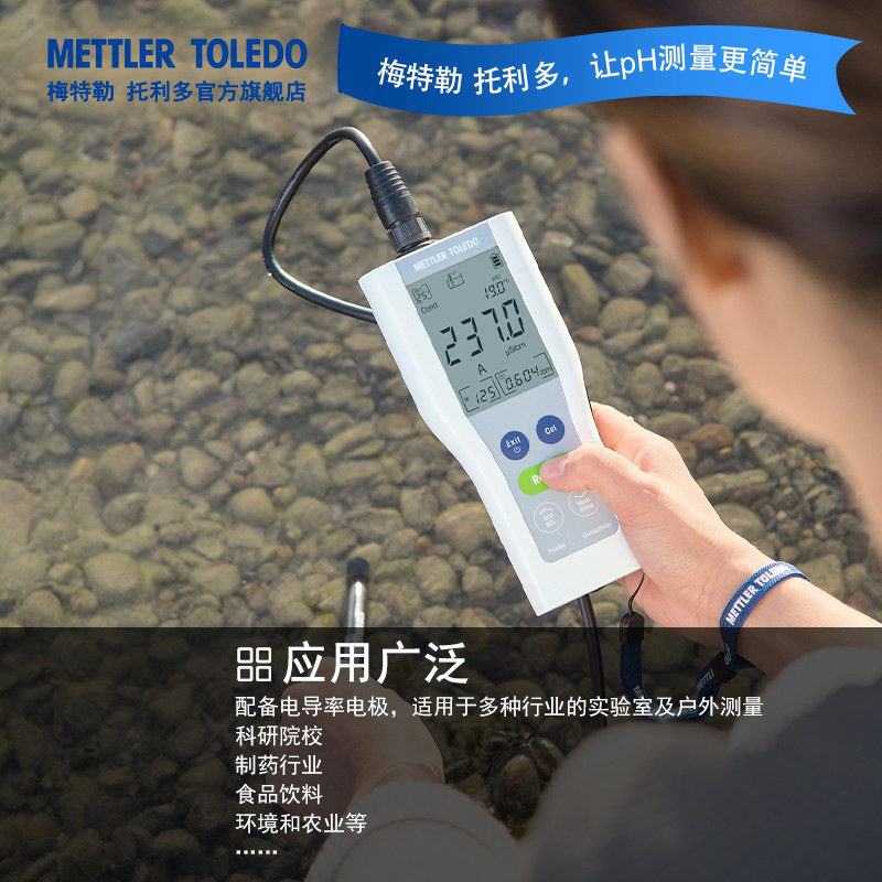 梅特勒托利多(METTLER TOLEDO)是百年瑞士品牌,全球领先的精密仪器与衡器制造商。其FiveGo™系列便携式电导率仪集高效测量、操控舒适、防水防尘和广泛应用于一体,专为实验室及户外复杂环境设计。 产品特点: - **高效测量**:大尺寸操作界面,按键简洁直观,支持自动/手动终点识别、终点提示音及图标,提升测量效率。 - **操控舒适**:采用人体工程学设计,握感舒适,适合各种手型;仪表背面配备可折叠支架,可立于台面,方便读数。 - **防水防尘**:达到IP67防护等级,有效抵御潮湿、灰尘及恶劣环境,确保野外或工业现场稳定使用。 - **应用广泛**:配备专业电导率电极,适用于科研院校、制药、食品饮料、环保、农业等多个行业的电导率和TDS测量。 主要配置参数: - 测量范围:0.00μS/cm~200mS/cm(电导率),0.01mg/L~200g/L(TDS),温度0~100℃ - 分辨率:自动可变(电导率),0.1℃(温度) - 精度:±0.5%(电导率),±0.5℃(温度) - 温度补偿:线性补偿,参比温度20℃/25℃ - 校准功能:1点校准,内置3组预设缓冲液 - 数据存储:可保存200组测量数据及校准信息 - 显示屏:3.1英寸段码LCD屏,清晰易读 - 接口:LTW 7-pin专用接口 - 电源:4×AAA电池,续航超200小时 - 外壳材质:ABS,坚固耐用 - 尺寸/重量:188×77×33mm / 0.26kg,轻巧便携 温馨提示:本产品由梅特勒托利多中国官方旗舰店销售,享受与线下同等售后服务。发货、发票及库存请咨询客服确认,不支持7天无理由退货,购买前敬请了解相关服务条款。