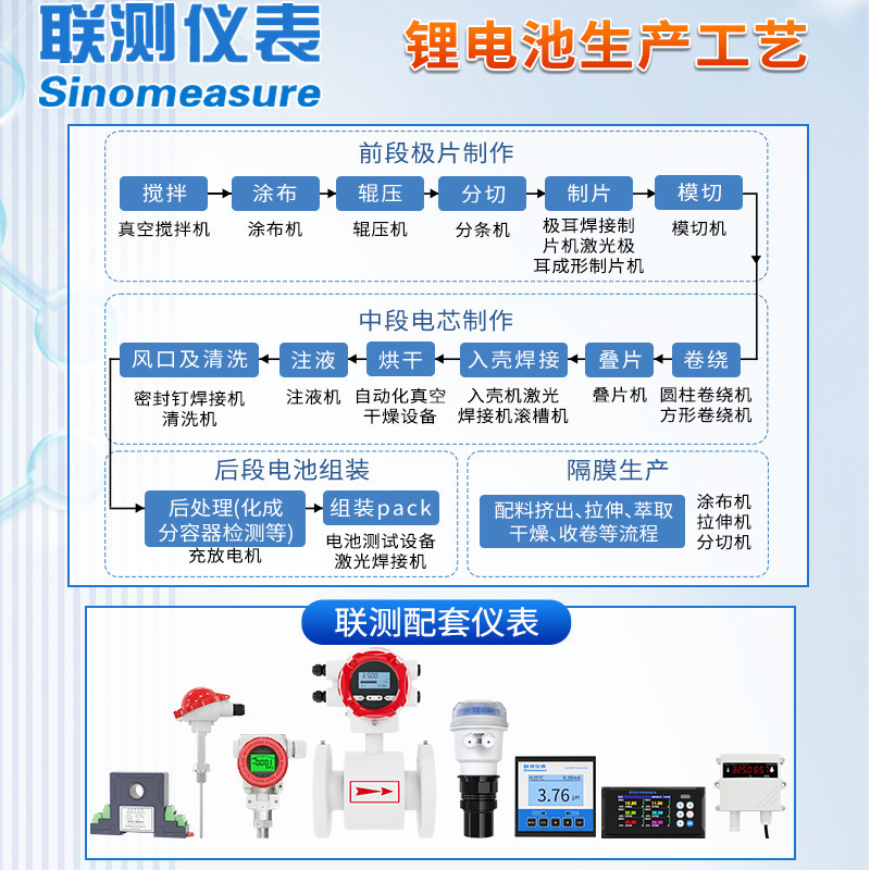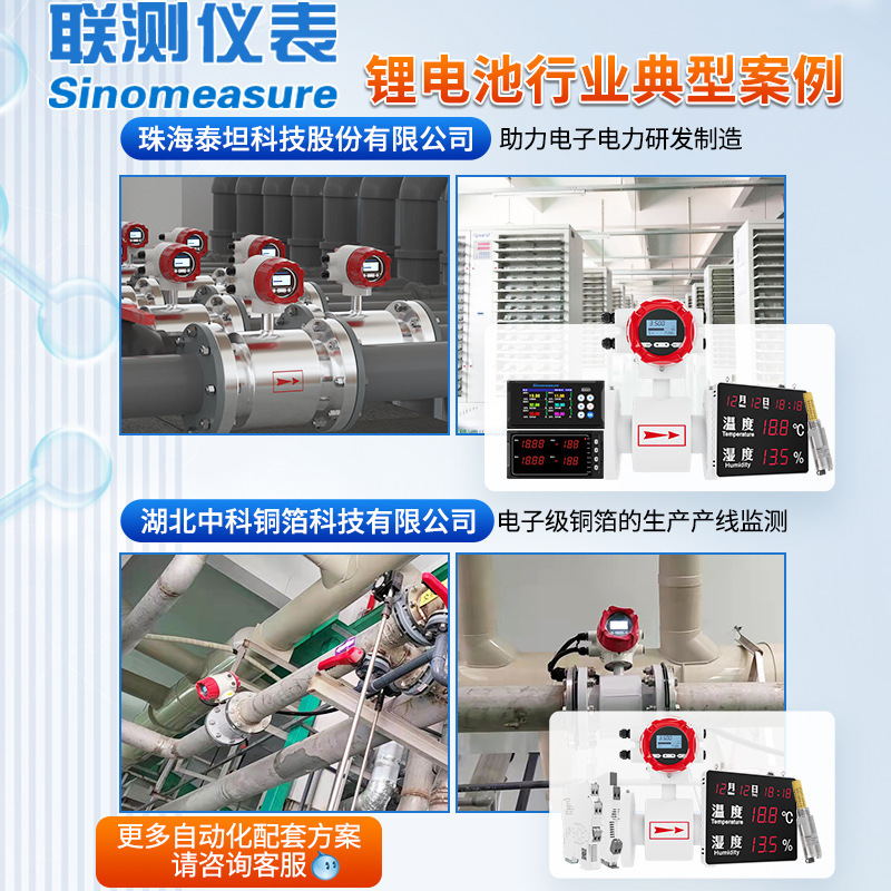 本方案覆盖锂电池制造全流程:前段极片制作(搅拌、涂布、辊压、模切)、中段电芯制作(卷绕/叠片、入壳、焊接)、后段电池组装与化成分容。配套提供Sinomeasure联测品牌多路温度巡检仪、无纸记录仪、电磁流量计、压力变送器、信号隔离器等自动化传感设备,广泛应用于珠海泰坦科技、珠海冠宇电池、中科铜箔等知名企业。支持无尘车间环境监控与水质、流量、物位、温度、压力的全过程监测,确保生产安全与品质稳定。联测深耕自动化领域十八年,拥有CE、SGS、实用新型专利等多项认证,具备年产30万套传感设备的制造能力,全国设立四大服务中心,提供售前售后技术支持,为锂电池行业智能化升级保驾护航。