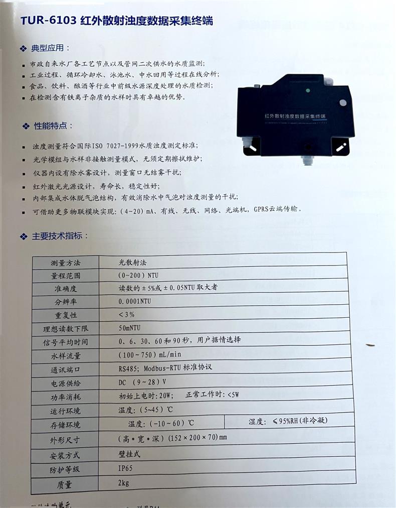 TUR-6103红外散射浊度数据采集终端是一款高性能在线水质监测设备,广泛应用于市政自来水厂、工业循环冷却水、泳池水、中水回用、食品饮料等行业水源深度处理的浊度检测。特别在检测含铁离子杂质水样时表现优异。 本产品采用符合国际ISO7027-1999标准的光散射法测量技术,配备红外激光光源,寿命长、稳定性高。光学模组与水样非接触式设计,无需定期擦拭,大幅降低维护成本。内置除水雾结构和脱气泡装置,有效避免测量窗口结雾和气泡干扰,确保数据精准可靠。 支持多种通信方式,包括RS485(Modbus-RTU协议)、4-20mA输出,并可扩展有线、无线、网络、光端机及GPRS云端数据传输,便于构建智能化水务管理系统。设备功耗低,防护等级达IP65,适合壁挂安装,适应复杂工业环境。量程为0-200 NTU,分辨率达0.0001NTU,具备优良的重复性和准确性,是实现全流程水质监控的理想选择。