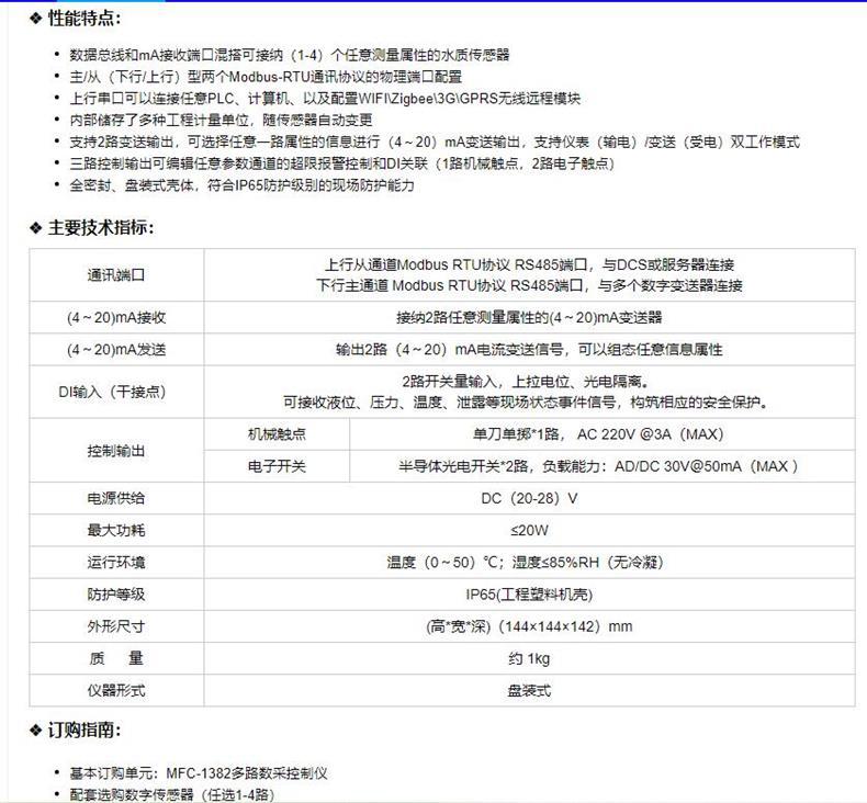 爱力浦(AILIPU)MFC-1382多路数采控制仪是一款高性能的水质监测与控制系统核心设备,兼容pH、溶解氧、浊度、流量、液位等多种传感器信号输入。设备支持数据总线与mA接收端口混搭,可接入1至4个不同测量属性的传感器,并配备主/从双Modbus-RTU通讯接口(RS485),实现与PLC、DCS或上位机的稳定通信,支持扩展WIFI、Zigbee、3G/GPRS等无线远程模块。 该仪表支持2路4~20mA信号输入和2路可组态的4~20mA变送输出,具备输电与受电双工作模式,灵活适配多种现场需求。提供三路可编程控制输出(1路机械触点+2路电子触点),可用于超限报警或联动DI信号,构建完善的安全保护机制。 产品采用全密封盘装式设计,达到IP65防护等级,适应恶劣工业环境。工作温度0~50℃,电源为DC 20-28V,最大功耗≤20W,外形尺寸144×144×142mm,安装便捷,广泛应用于水处理、环保、化工等领域的自动监控系统。