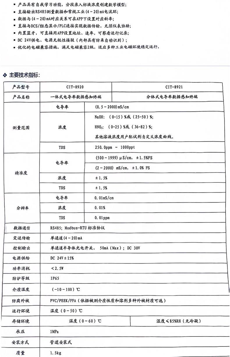 阔思CIT-8920/1感应式电导率数据感知终端是一款专为工业复杂环境设计的高可靠性在线监测设备,广泛应用于化学制程、石油含水率、污水处理、海水淡化、电镀液监控及环保监测等领域。特别适用于食品、饮料、酿酒和奶制品行业的CIP(就地清洗)过程中的电导率监测。 本产品采用先进的感应式测量技术,实现非接触、无极化测量,适用于高量程、高粘度、强腐蚀性液体,具有优异的抗污染、耐附着、耐高温和耐腐蚀性能。提供多种安装方式,包括管道一体式、分体式及角向式(水平/竖直),适配多样化工况需求。 设备内置常用酸碱浓度模型,支持用户自定义标液曲线,并具备自我学习功能,可分段建立数学模型提升测量精度。支持RS485 Modbus-RTU通信协议和标准4-20mA模拟信号输出,可直接接入DCS、PLC或组态系统,无需额外仪表转换。内置蓝牙模块,可通过APP无线设置地址、波特率、校准参数及查看运行记录,操作便捷。 防护等级达IP65,工作温度范围宽,电源支持DC24V±15%且具备无极性接驳保护,整机功耗低于2.5W,电磁兼容性符合工业2级标准,确保在复杂电磁环境中稳定运行。是现代工业自动化与智能化监测的理想选择。