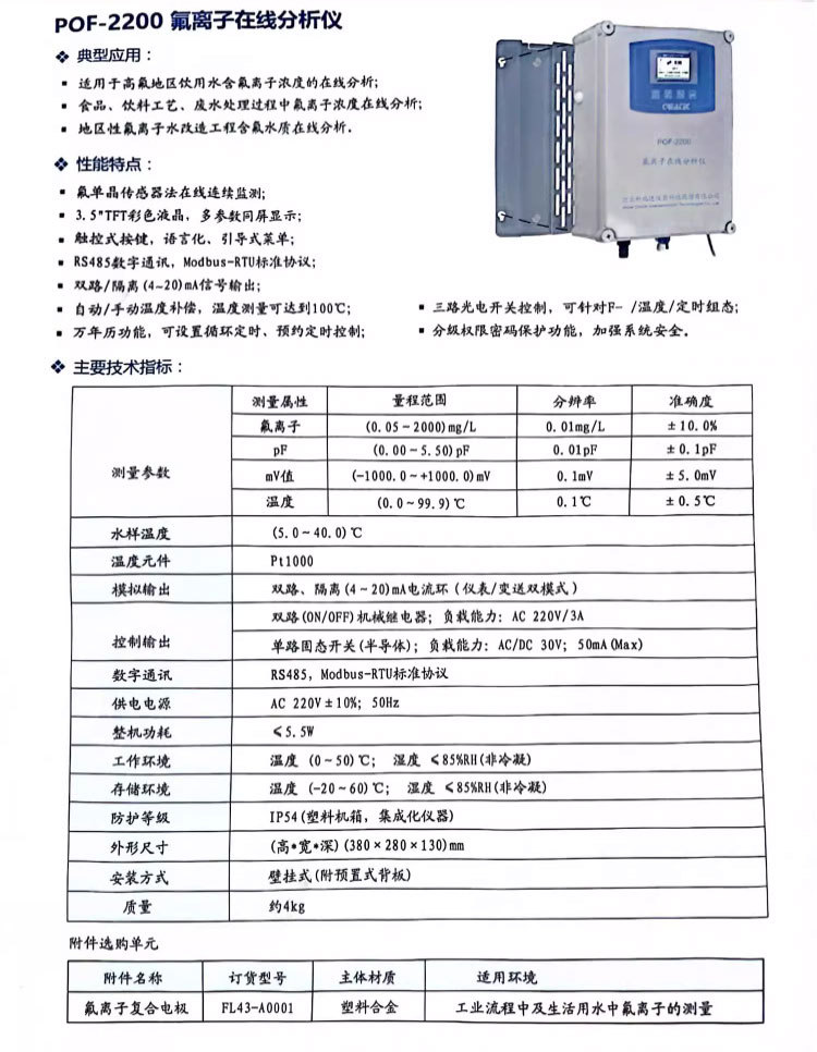 阔思POF-2200氟离子在线分析仪适用于高氟地区饮用水、食品饮料工艺及废水处理过程中氟离子浓度的在线连续监测,广泛应用于地区性除氟水处理工程。仪器采用先进的氟单晶传感器技术,确保测量稳定可靠。配备3.5英寸TFT彩色液晶屏,支持氟离子浓度(0.05-2000 mg/L)、pF值、mV值及温度等多参数同屏显示,操作界面为触控式按键,菜单语言化、引导式设计,便于快速设置与操作。 设备支持RS485数字通讯,兼容Modbus-RTU协议,具备双路隔离4-20mA模拟输出,适用于多种控制系统集成。具备自动/手动温度补偿功能,温度测量范围可达100℃,并配置三路光电开关,可灵活组态F-、温度或定时控制模式。内置万年历功能,支持循环和预约定时控制,配合分级密码权限管理,提升系统安全性。 主要技术指标包括:氟离子测量分辨率达0.01mg/L,准确度±10.0%;温度测量范围0.0~99.9℃,分辨率0.1℃;整机防护等级IP54,壁挂式安装,适应工业现场复杂环境。标配FL43-A0001塑料合金材质氟离子复合电极,适用于工业流程与生活用水中的氟离子测量,也可根据需求选配其他附件,满足多样化应用场景。