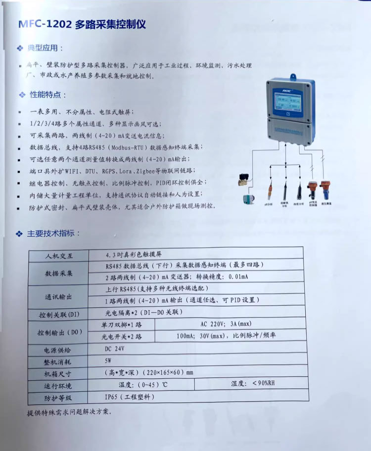 阔思MFC-1202多路采集控制仪是一款扁平壁装式防护型智能控制器,广泛应用于工业过程控制、环境监测、污水处理、市政工程及水产养殖等场景,实现多参数采集与就地自动控制。设备配备4.3英寸真彩色电阻式触摸屏,支持多种显示风格,操作直观便捷。