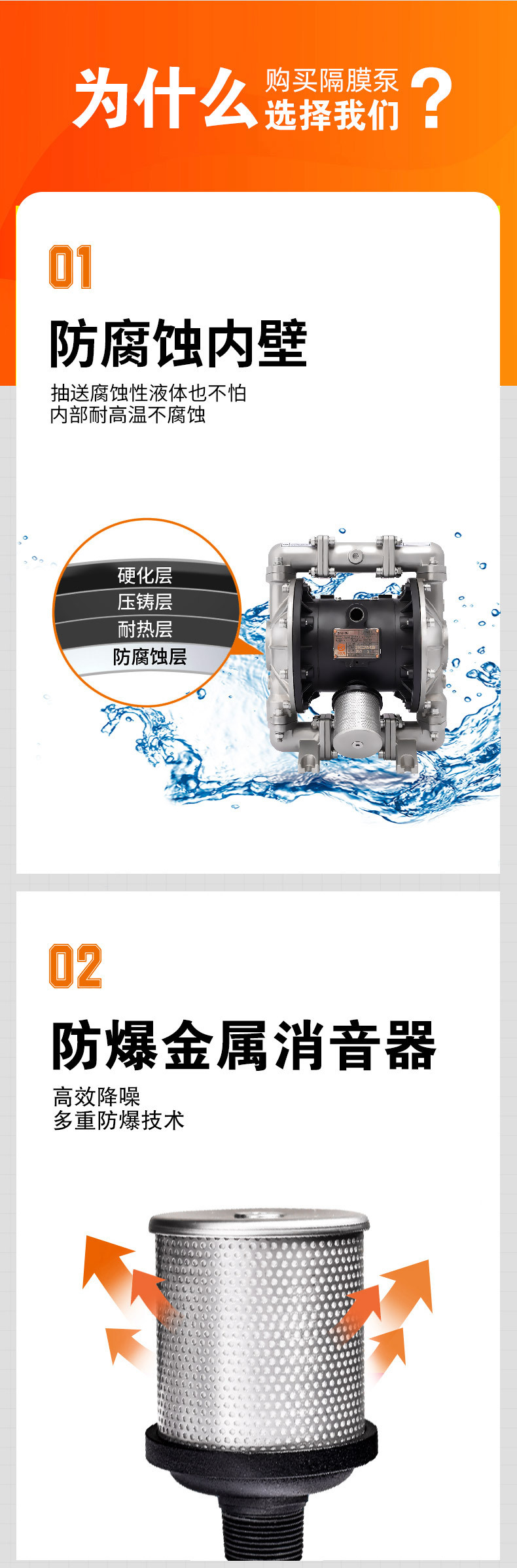 爱力浦(GTS)工业级气动隔膜泵,专注隔膜泵研发生产33年,产品通过防爆合格证、欧盟CE认证和品质标认证,安全可靠。采用压缩空气驱动,可空运行、无电火花,适用于易燃易爆环境,效能稳定。 泵体具备多重防腐设计:防腐蚀内壁、硬化层、压铸层、耐热层,确保长期输送腐蚀性液体不损坏。配备防爆金属消音器,高效降噪,提升使用体验。 多种材质可选:铝合金(轻度耐腐)、316不锈钢(强耐腐,适用于食品、化学品)、PP工程塑料(耐一般腐蚀)、氟塑料及衬氟材质(耐强酸强碱如硫酸、盐酸、氢氟酸等),满足不同工况需求。 广泛应用于电子企业输送酸性物料、新能源企业输送磷酸铁锂浆料、化工企业输送氨酸等腐蚀性原料。配套变频电机与脉冲阻尼器,提升输送稳定性。 型号齐全,流量覆盖22~1041 L/min,扬程最高84米,支持DN10~DN125口径选择,满足小流量到大流量多种场景。边锋机械集团出品,服务超10万客户,中粮、徐工、伊利、比亚迪、国药等五百强企业共同选择。全国包邮,支持海外发货,快速响应,售后无忧。