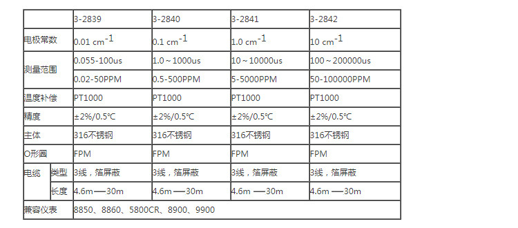 2839-2842电导率/电阻率电极有四种电机常数,0.01、0.1、1.0和10.0适合测量从纯水到弱酸弱感性溶液。