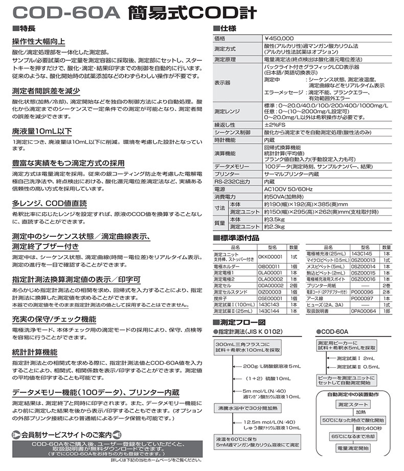 SEKO COD-60A简易式COD测定仪是一款高度自动化的水质分析设备,专为化学需氧量(COD)的快速准确测定设计。仪器采用一体化酸化与滴定处理系统,仅需将样品和试剂加入测定容器,按下启动键即可自动完成加热、氧化、冷却和电量滴定全过程,显著提升操作便捷性并减少人为误差。