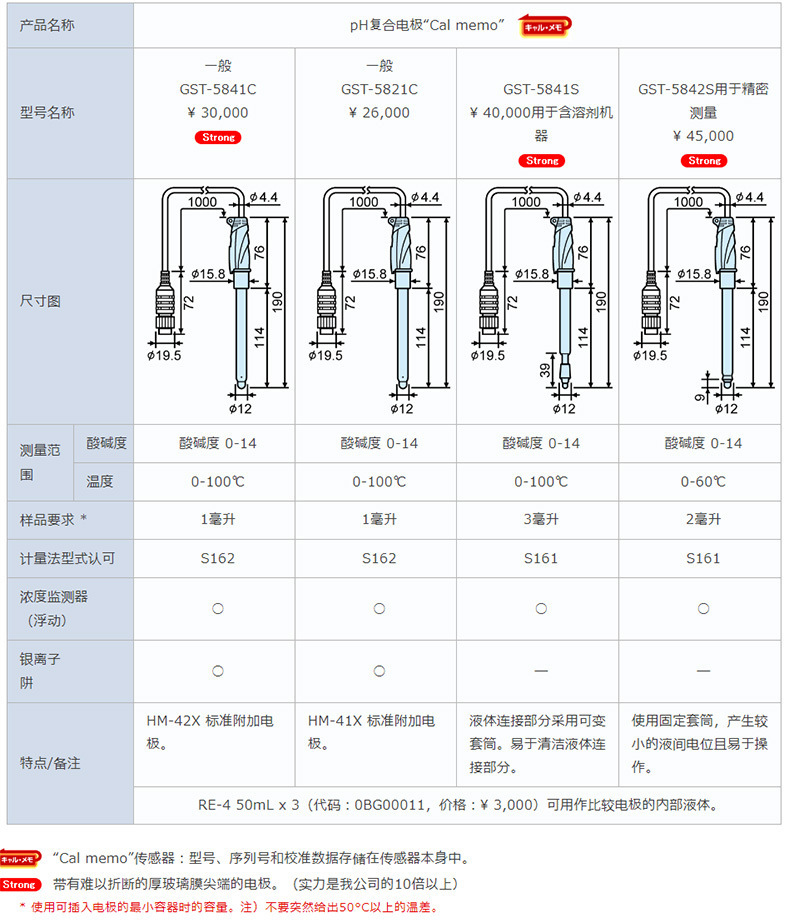 本系列产品为三信(Sanxin)专为HM-40P设计的pH及ORP复合电极,包括GST-2739C、GST-5841S、ELP-040、PST-2739C等多种型号,满足不同应用场景需求。产品涵盖一般用途、有机溶剂测量、强酸环境及微量样品检测,具备防水设计与‘Cal memo’数据存储功能,自动保存型号、序列号和校准信息。部分型号配备银离子阱、可更换玻璃头或厚膜抗冲击结构,提升耐用性与测量精度。电缆长度提供1m至11m多种选择,适配HM-41X、HM-42X等仪表。配套温度传感器ELT-001/ELT-002可实现完整热控测量。所有电极均符合日本计量法型式认证,确保合规与可靠性。