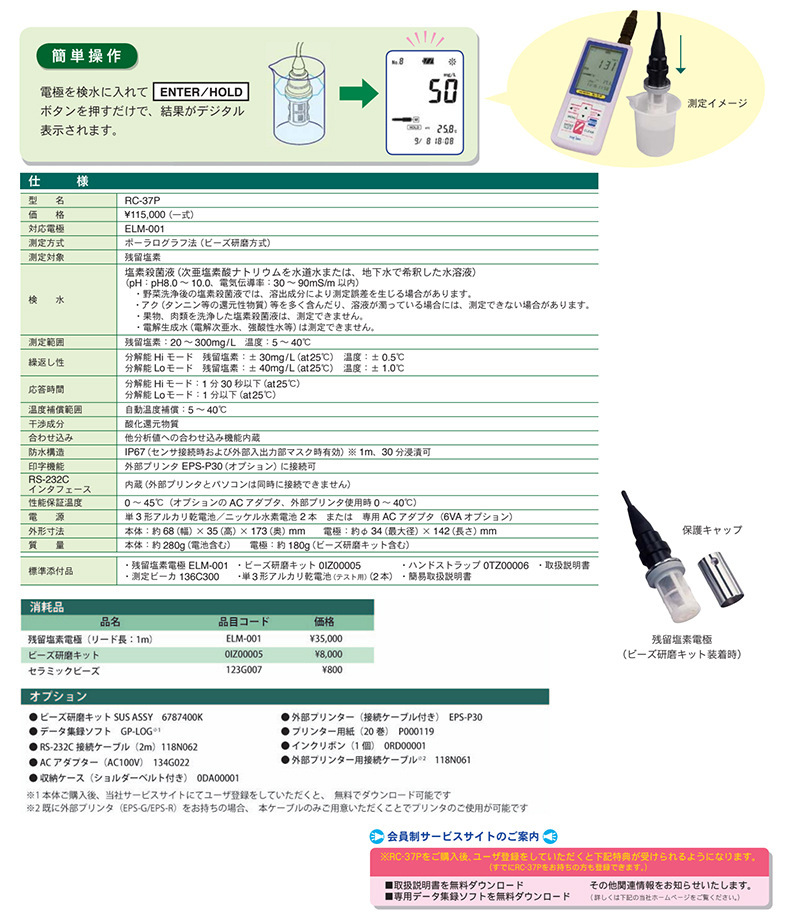 威玛VERSA-MATIC RC-37P是一款专用于测定残留氯的便携式水质分析仪,采用先进的无试剂测量技术(术一步口夕7法),无需添加药剂,避免了试剂处理和污染问题,操作更简便、环保。仪器配备ELM-001专用电极,测定范围为20~300mg/L残留氯,适用于次氯酸钠水溶液、自来水、地下水及清洗消毒液等(pH 8.0~10.0)的检测。 该设备具备IP67级防水结构,可浸没于1米深水中30分钟,适合现场使用。支持自动温度补偿(5~40℃),响应时间快(低浓度档1分钟内),并可通过RS-232C接口连接打印机或电脑,实现数据输出与记录。标配包括电极、研磨头组件、连接线及操作手册。 适用场景:食品加工清洗液监控、水处理厂、泳池水质管理、环境监测等。注意:含还原性物质、浑浊液体或电解生成水可能影响测量精度。配套提供电极、研磨头、清洁布等耗材及AC适配器、打印电缆等配件,确保长期稳定运行。