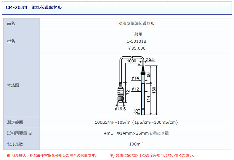 三信CM-20J浸渍型电导率仪,型号C-50101B,适用于一般用途的电导率测量。测量范围为100μS/m至10S/m(等同于1μS/cm至100mS/cm),重复性优异。设备所需样品量仅为4mL,采用Φ14mm×26mm专用样品池设计,便于操作与清洗。电极常数为100m⁻¹,适合多种液体电导率检测。产品尺寸适配SS标准接口,价格为35,000日元,广泛应用于水质分析、工业过程控制等领域,确保测量准确可靠。