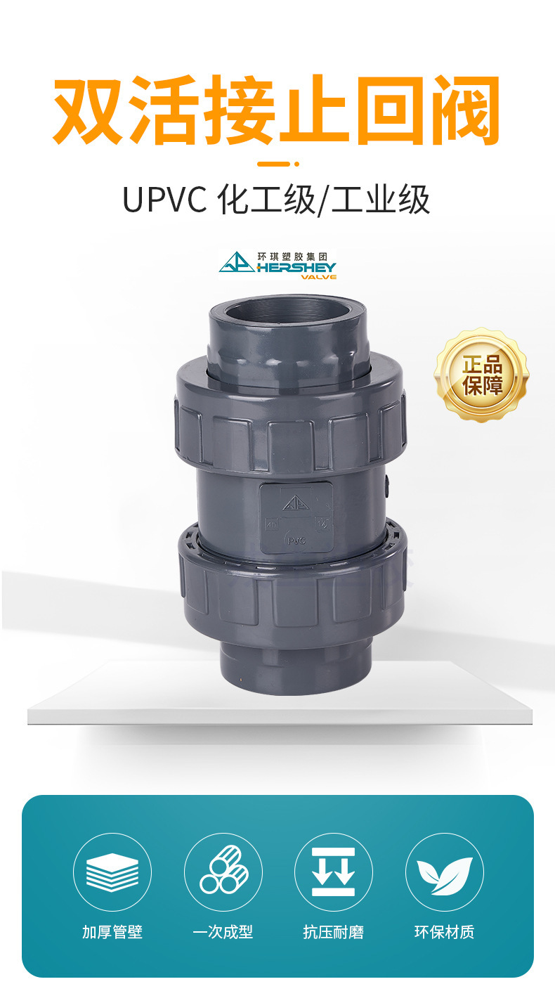 双活接止回阀,采用优质UPVC、CPVC、PP、PVDF等化工级/工业级材料一体成型,具有抗压、耐磨、耐酸碱、耐腐蚀、不透光等特点。产品内壁光滑,流体阻力小,密封性强,确保系统安全运行。适用于半导体、电子工业、药品生产、化工反应、电镀工艺等多个高端制造领域。提供DN15至DN50多种规格,连接方式为双活接设计,安装维护便捷。环琪塑胶集团HERSHEY VALVE正品保障,广泛应用于高纯度与强腐蚀性介质输送系统。