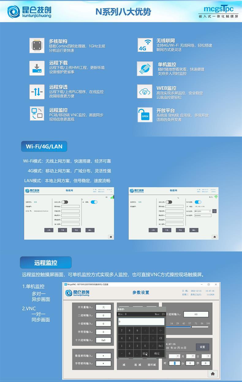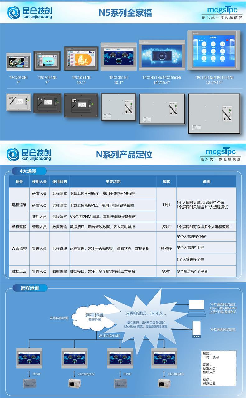 昆仑技创N系列物联网触摸屏是一款高性能嵌入式一体化HMI设备,涵盖7寸、10寸、12寸、14寸、15寸全系列型号(如TPC7022Ni、TPC1031Nt、TPC1551Ni等),搭载ARM或Cortex-A53多核处理器,主频高达1GHz,运行稳定流畅。产品支持4G、Wi-Fi和LAN三种联网方式,满足工业现场灵活组网需求。 N系列集成MCGS组态软件,具备远程下载/上传HMI工程、VNC画面同步监控、PLC程序穿透调试、WEB云端监控及数据接口对接第三方平台等功能,广泛应用于远程运维、单机监控、企业大屏管理和数据上云场景。支持Modbus、MQTT、HJ212等多种通讯协议,实现设备集中管理与智能控制。 设备采用工业级设计,前面板防护等级达IP65,适应0℃~50℃工作环境,配备TFT液晶屏(分辨率800×480至1024×600),支持四线电阻式触摸,接口丰富(RS232、RS485、USB、LAN),适用于各类工业自动化、智能制造与远程监控系统,助力企业实现数字化升级。