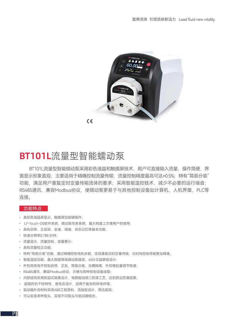 爱宝BT101L流量型智能蠕动泵采用真彩色液晶屏与触摸屏设计,操作直观便捷,用户可直接输入所需流量,实现精准控制,最高控制精度可达±0.5%。产品搭载LF-Touch-OS智能软件系统,集成启停、正反转、全速、调速及运行状态记忆等丰富功能。具备液量累计、流量校正和独特的‘简易分装’功能,通过精确控制电机步数,实现比时间控制更准确的重复定量传输。支持RS485通讯并兼容Modbus协议,便于与PLC、人机界面、计算机等设备集成。内置智能温控系统,运行噪音低至45分贝,实现超静音工作。外控支持高低电平启停、正反转及模拟量调速,光耦隔离增强抗干扰能力。驱动器采用双层隔离结构与三防漆工艺,防尘防潮,适应复杂供电环境。外壳为ABS工程塑料流线型设计,美观耐用,可适配多种泵头,灵活满足不同流量需求。