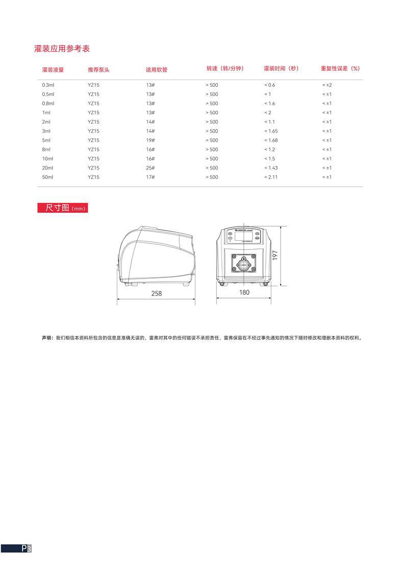 BT101F分配型智能蠕动泵专为高精度液体灌装设计,适用于0.3ml至50ml多种灌装量需求。根据灌装液量匹配不同型号软管(如13#、14#、16#、17#、19#、25#)及YZ15泵头,确保流量稳定。设备运行转速高于500转/分钟,灌装时间最短可达0.6秒以内,重复性误差控制在±1%以内,部分工况下可达±2%或±7%,满足实验室、医药、食品等领域的精密分配要求。产品尺寸为258×180mm,结构紧凑,易于集成。注:本资料信息由厂家提供,品牌为雷弗,其保留随时更新内容的权利,恕不另行通知。