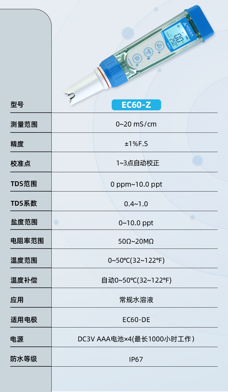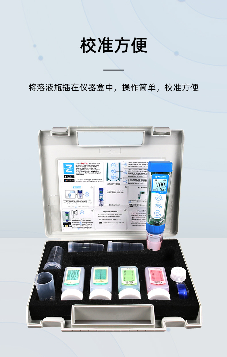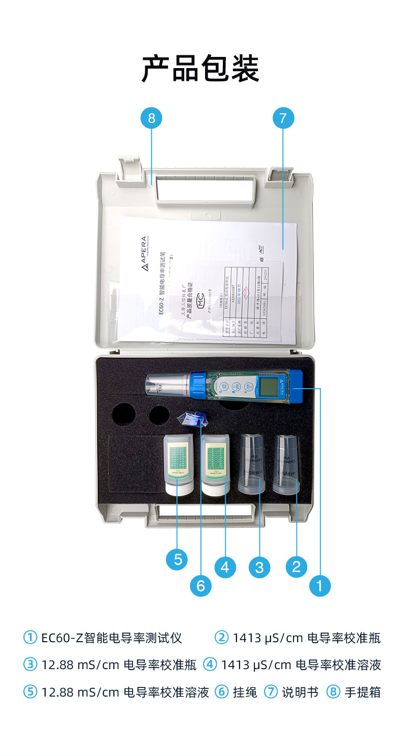 APERA EC60-Z智能电导率测试仪是一款专为专业水质测量设计的高精度便携式仪器,由上海三信沛瑞(SANXIN CAPERA)原厂生产,品牌源自中国,畅销美日欧市场。该仪器支持蓝牙连接ZenTest智能APP,实现手机与设备双向控制,即使无手机也可独立使用。 产品配备坚固型铂黑电极(EC60-DE),具备优良导电性能和耐用性,支持可更换设计,延长仪器使用寿命。IP67级全机身防水防尘,适用于复杂环境下的现场测量。支持四种显示模式:基本模式、指针模式、曲线模式和列表模式,便于趋势分析与数据管理。 测量范围覆盖0~20mS/cm,精度达±1%F.S,同时支持TDS、盐度、电阻率和温度测量,自动温度补偿(0~50℃),适用于常规水溶液的多场景应用,广泛用于教育科研、环境监测、饮品质量、污水处理、农业灌溉及生活用水等领域。 内置GLP数据管理功能,支持手动/自动存储、校准提醒、测量值报警、GPS定位标记、照片附加等功能,数据可通过APP轻松导出与分享。标配包括测试仪、两种校准液(1413μS/cm 和 12.88mS/cm)、挂绳、手提箱及说明书等。 本产品享受2年全国联保,支持开具13%增值税专用发票或普通发票(需备注开票信息),订单满2000元即赠定制皮革笔记本+水性笔(价值50元)。三信专注电化学分析30年,拥有ISO9001:2015、CE、RoHS等多项权威认证,品质值得信赖。