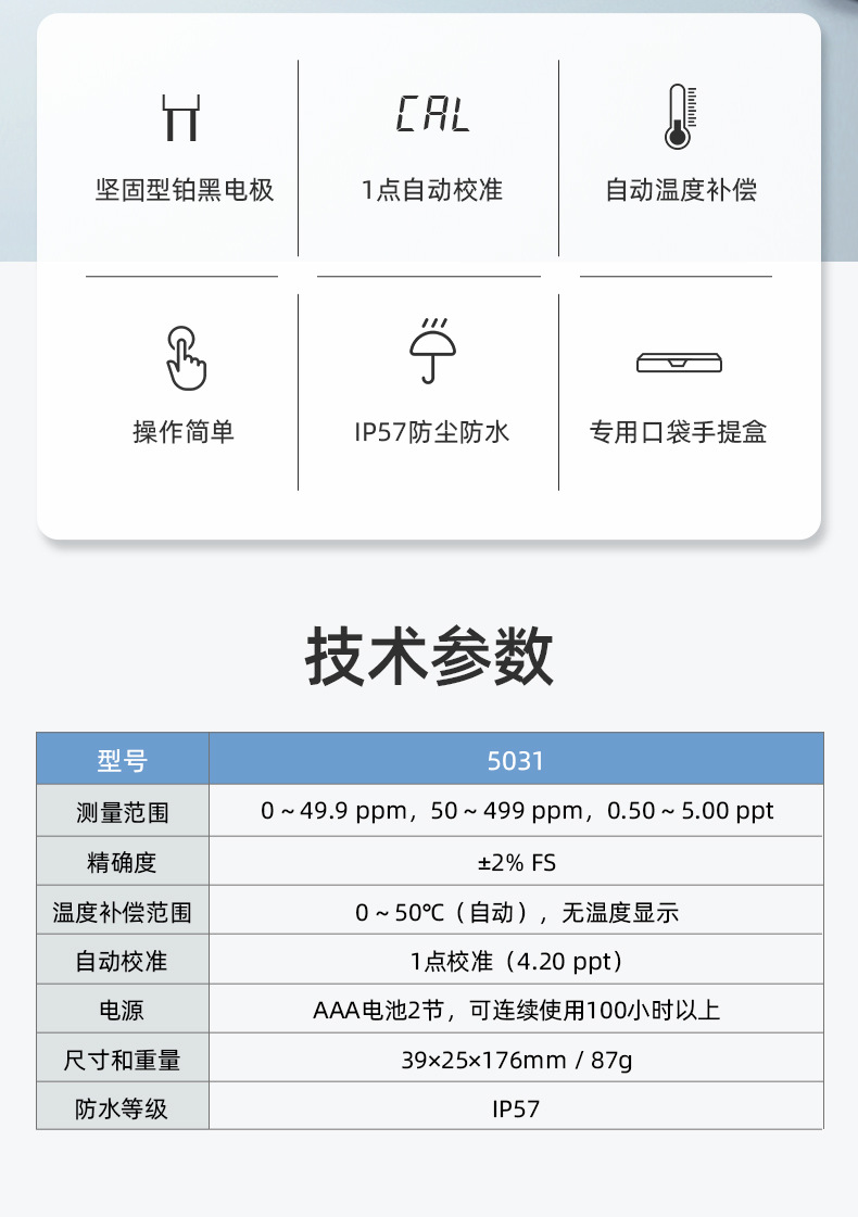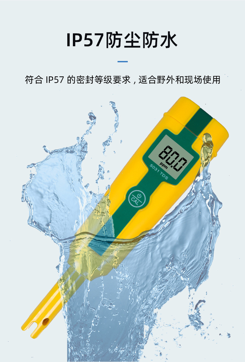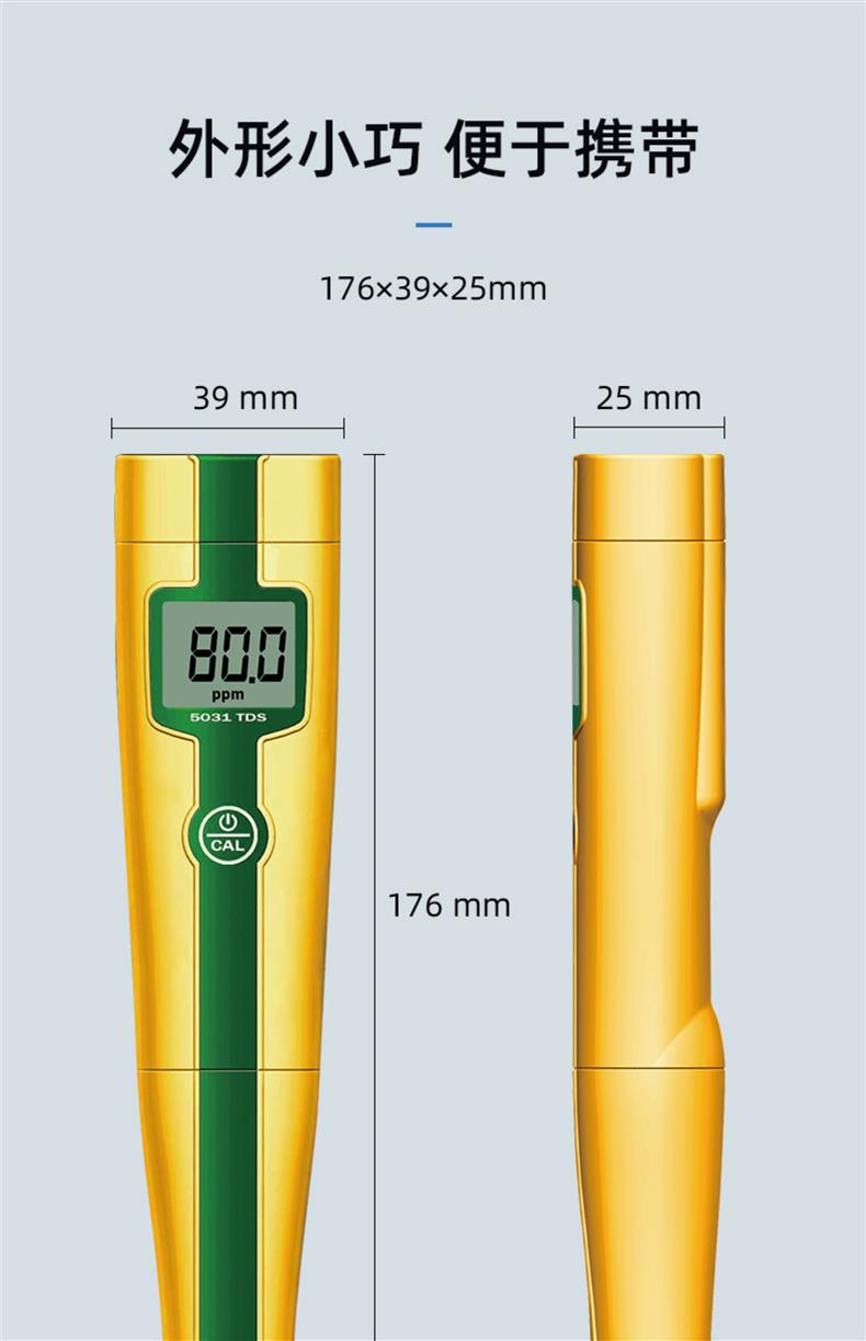 SANXIN APERA 5031经济型TDS测试笔是一款专为专业水质测量设计的高性价比便携仪器。采用坚固型铂黑电极,具备1点自动校准和0~50℃自动温度补偿功能,测量范围覆盖0~49.9ppm、50~499ppm及0.50~5.00ppt,精度达±2%FS。设备仅需单键操作,支持短按开关机与长按校准,使用便捷。整机尺寸为176×39×25mm,重量仅87g,轻巧易携,符合IP57防尘防水标准,适合实验室、现场监测、教育科研、水产养殖、游泳池管理等多种应用场景。标配包括TDS校正液、电池、说明书及专用手提盒。产品由上海三信仪表厂原厂生产,通过ISO 9001:2015质量体系认证,全球畅销美日欧等50多个国家。享受2年质保,支持开具13%增值税发票,满2000元赠定制礼品,是高可靠性与实用性的理想选择。