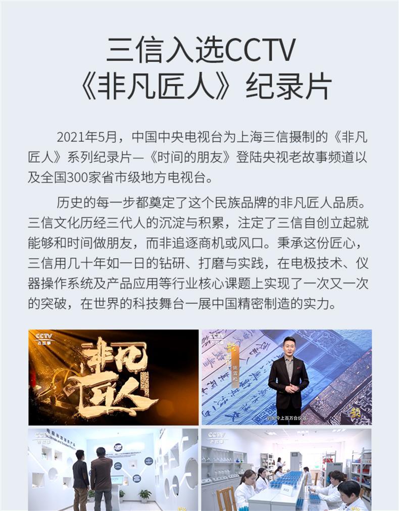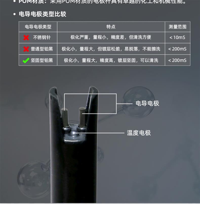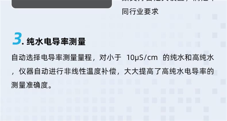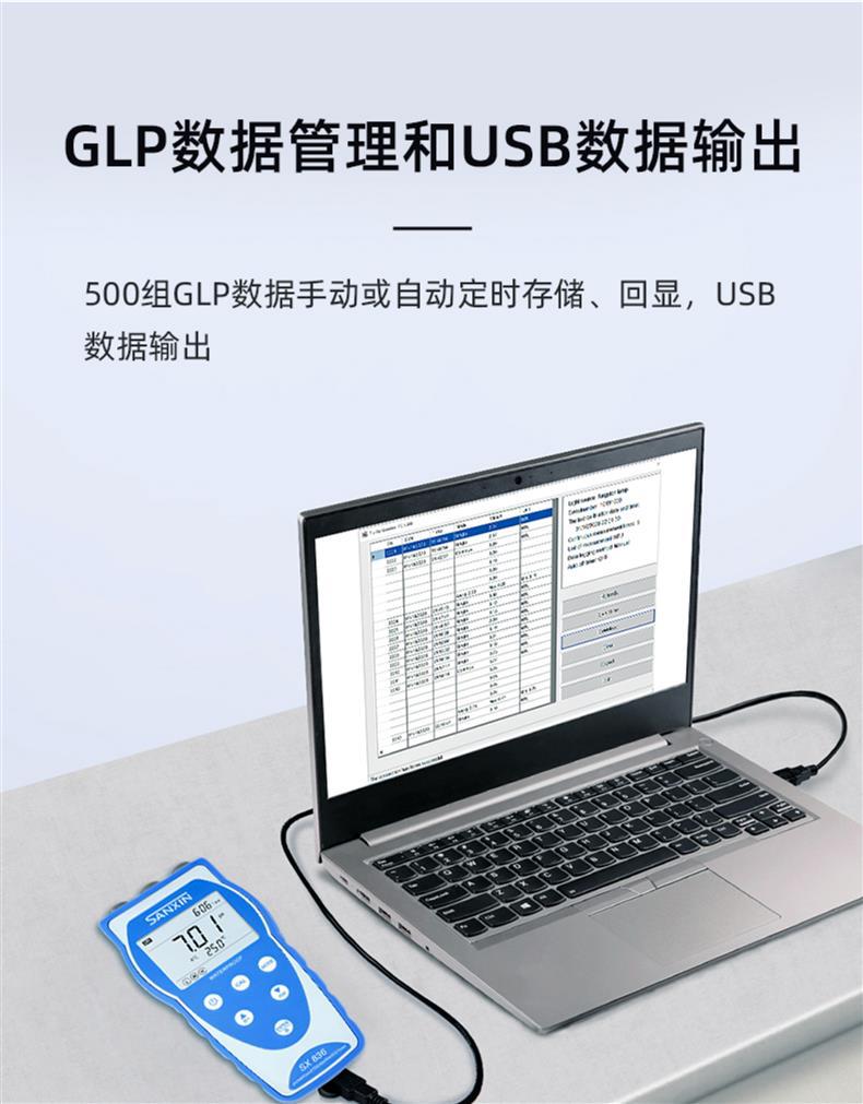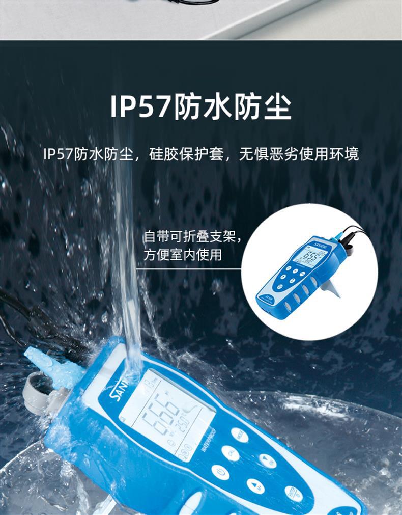SANXIN SX813便携式电导率仪是一款专为现场高精度测量设计的多功能水质分析仪器,广泛应用于科研、环境监测、水处理、电力及石化等行业。仪器可测量电导率、TDS、盐度、电阻率和温度,配备坚固型铂黑电极(型号2301T-Q,K=1),具有极化小、量程宽、精度高、耐腐蚀、可清洗等优点,特别适合低电导率样品如纯水、蒸馏水的精确测量。 SX813采用16位TI智能芯片,具备超低功耗和先进的数字滤波技术,提升响应速度与测量准确性。支持1~3点自动校准,自动识别8种标准溶液,标配三瓶长效校准液(146.6μS、1408μS、12.85mS),并可查看上次校准时间,设置校准提醒。具备自动温度补偿功能(0~50℃),对高纯水自动进行非线性温度补偿,显著提高测量精度。 仪器内置500组GLP数据存储,记录编号、时间、日期、测量值及温度,支持USB数据输出与PC-Link通讯软件连接,便于数据管理与分析。IP57级防水防尘设计,搭配硅胶保护套和可折叠支架,适应各种恶劣使用环境。电源支持3节AA电池或USB 5V供电,方便户外长时间作业。 装箱包含:SX813主机、2301T-Q电导电极、三瓶校准液、USB电缆、通讯软件光盘、手提箱及说明书。整机享受2年保修,电极6个月保修。上海三信专注电化学分析30年,产品通过ISO 9001:2015、CE、RoHS认证,畅销美国、日本、欧洲等50多个国家,是中国精密仪器走向世界的代表品牌。