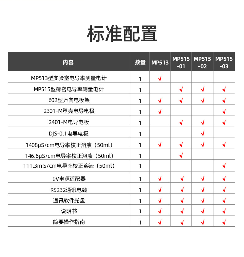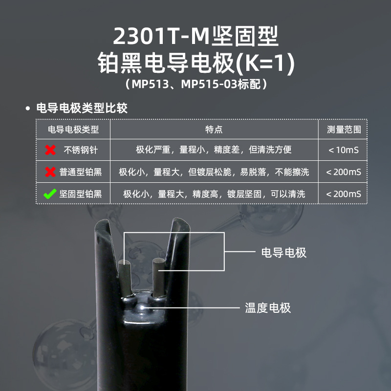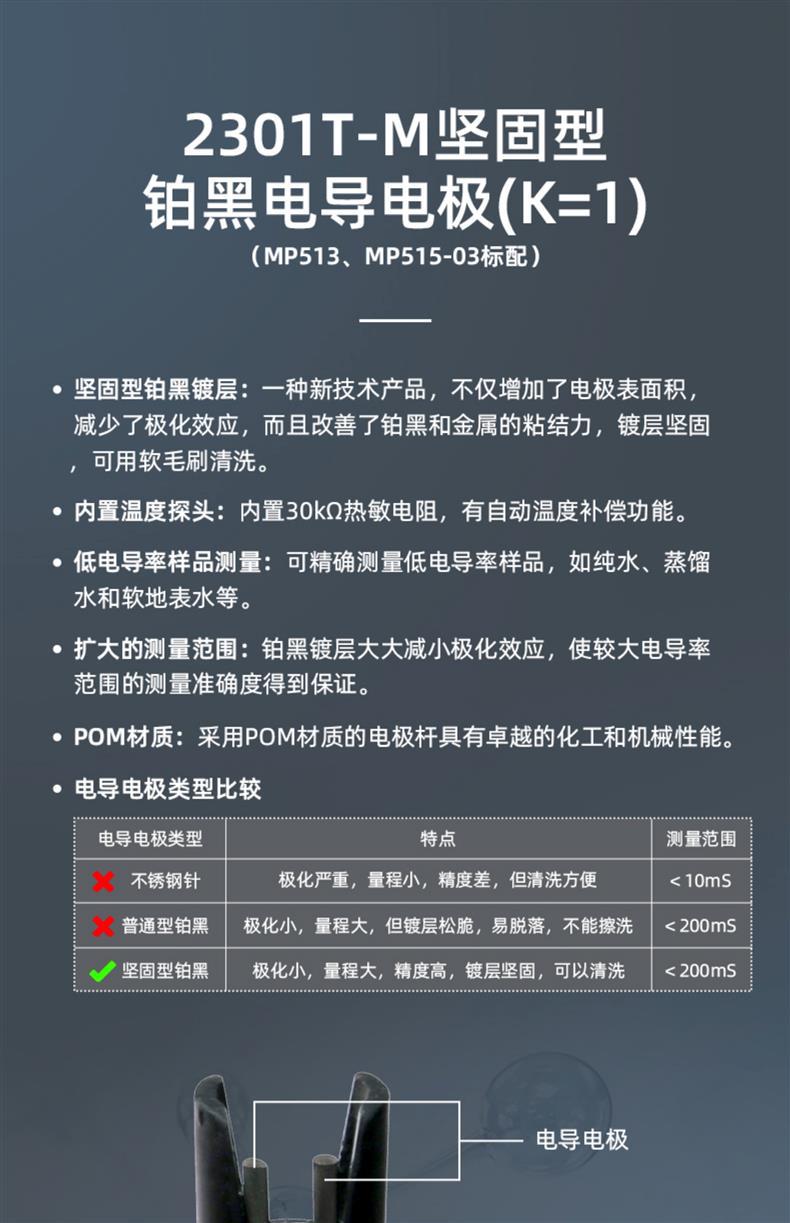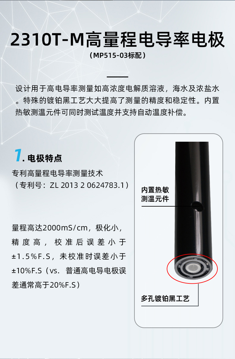 SANXIN(上海三信)MP500系列台式电导率仪是专为实验室和工业环境设计的高精度水质分析仪器,具备电导率、电阻率、TDS、盐度和温度多参数测量功能。该系列包含MP513、MP515-01、MP515-02和MP515-03四种型号,满足从常规水样到高纯水、高浓度溶液的广泛测量需求。 产品标配坚固型铂黑电导电极,采用先进镀层技术,减少极化效应,提升测量稳定性和耐用性,支持软毛刷清洗。内置温度探头实现自动温度补偿,确保测量准确性。MP515系列支持600组GLP数据存储,并配备RS232接口,便于数据导出与电脑连接。 MP515-02专为高纯水设计,配备DJS-0.1-M电极;MP515-03适用于高浓度电解质、海水等场景,量程高达2000mS/cm。仪器符合IP54防尘防溅标准,操作安全可靠。 三信拥有30年电化学分析经验,产品通过CE、ISO9001:2015、RoHS等多项国际认证,远销美国、日本、欧洲等50多个国家。品牌旗下APERA(沛瑞)在美国、德国、日本设有分公司,提供全球技术支持。 购买即享2年仪器保修、6个月电极保修,支持开具13%增值税专用发票。订单满2000元赠送定制皮革笔记本+水性笔,多件购买享阶梯折扣,性价比高。
