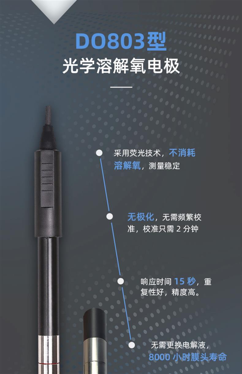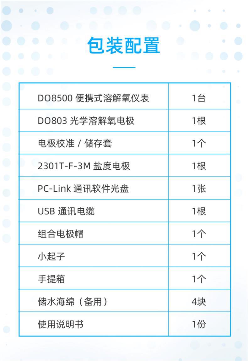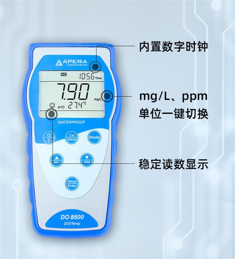 SANXIN CAPERA(上海三信沛瑞仪器科技有限公司)D08500光学溶解氧仪是一款专业级便携式水质检测设备,采用先进的荧光法光学技术,搭载DO803光学溶解氧电极,测量过程中不消耗氧气,确保读数稳定、响应迅速(≤15秒),无需频繁校准,使用寿命长达8000小时。仪器具备自动温度补偿(ATC)、自动气压补偿和自动/手动盐度补偿功能,测量范围为(0-20.00)mg/L或(0-200.0)%,分辨率高达0.01mg/L,准确度为±2%读数或±0.2mg/L(取大值)。内置数字时钟、500组数据存储及定时记录功能,支持USB数据输出与PC通讯软件对接。LCD背光大屏清晰显示,操作简便,符合IP57防水等级,可在1米水深下浸泡30分钟,适合现场使用。标配手提箱、盐度电极(2301T-F-3M)、校准套件等完整配件,广泛应用于环境监测、教育科研、饮用水质管理、水处理、水产养殖、游泳池与温泉等领域。产品通过ISO 9001:2015、CE、RoHS认证,享受全国联保2年服务,是高可靠性与高性能的国产电化学水质分析代表之作。