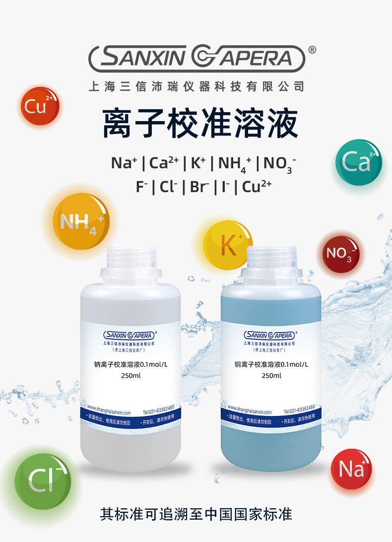 上海三信沛瑞仪器科技有限公司(原上海三信仪表厂)专业研发生产电化学水质分析产品30年,旗下品牌SANXIN CAPERA提供高精度离子校准溶液,包括钠(Na⁺)、铜(Cu²⁺)、钙(Ca²⁺)、钾(K⁺)、铵(NH₄⁺)、硝酸根(NO₃⁻)、氟(F⁻)、氯(Cl⁻)、溴(Br⁻)、碘(I⁻)等多种0.1mol/L标准溶液,规格为250ml。本系列产品符合中国国家标准,量值可追溯,专为离子选择性电极校准设计。由于低浓度溶液易受污染,建议使用时适量倒出、避免倒回,并在开封后尽快使用。公司通过ISO 9001:2015质量管理体系认证,产品出口全球50多个国家,品质可靠,广泛应用于实验室、环境监测与工业过程控制领域。