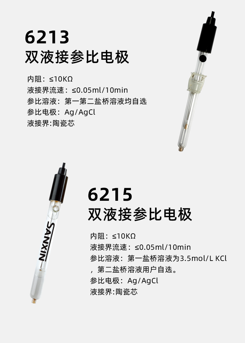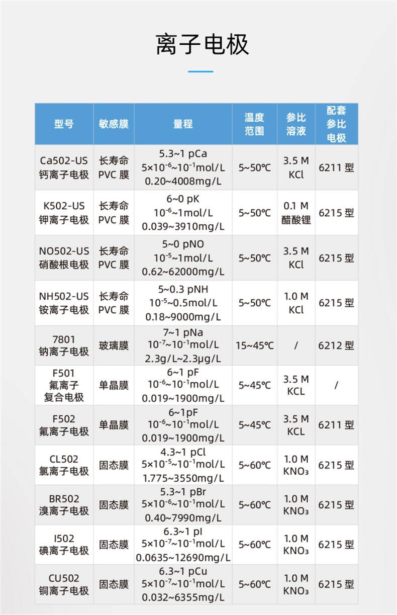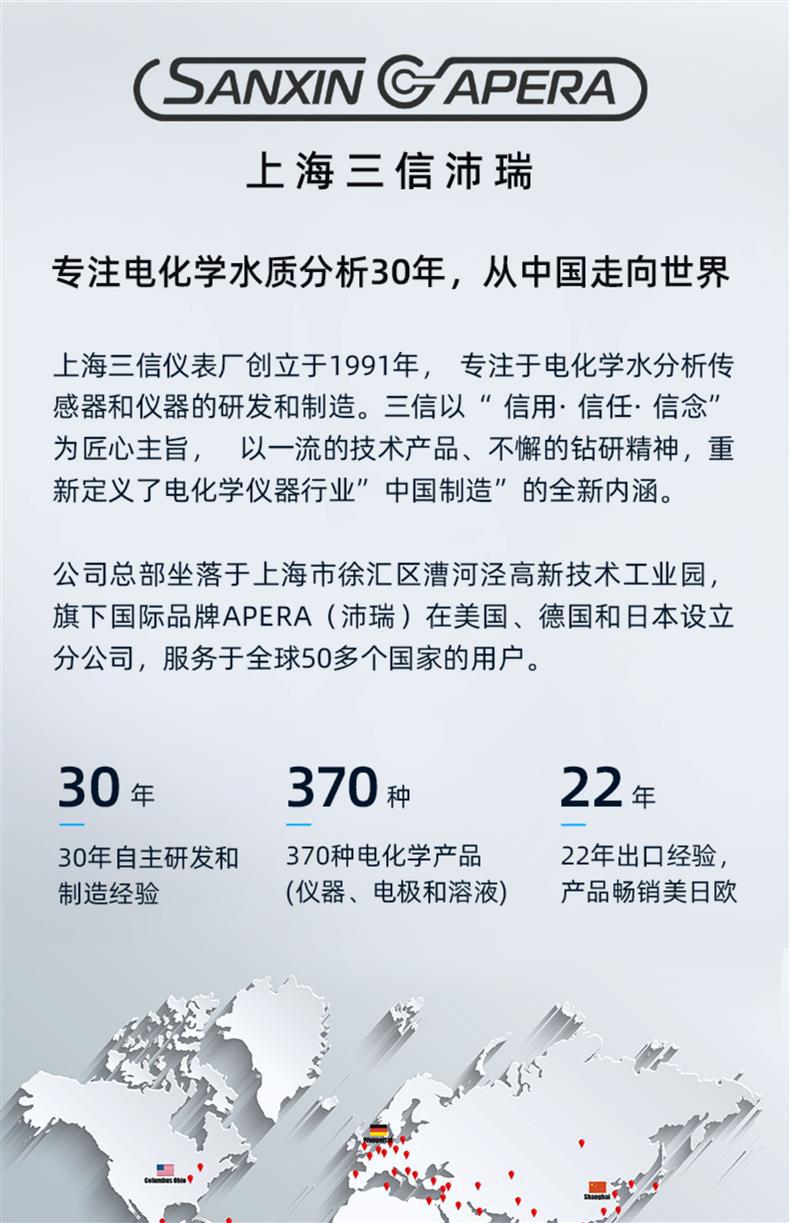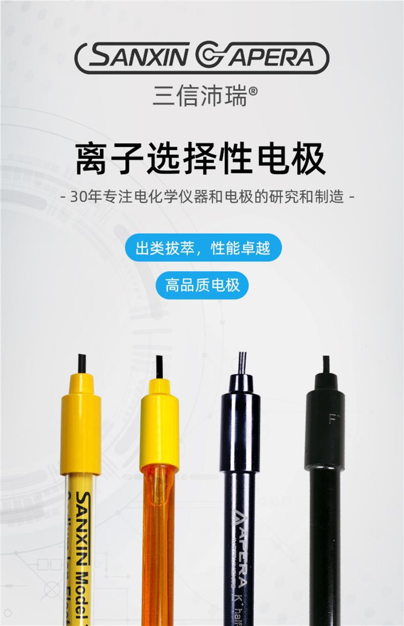 上海三信沛瑞仪器科技有限公司(SANXIN CAPERA)专注电化学仪器与电极研发制造30年,致力于为水质分析提供精准可靠的解决方案。公司旗下品牌APERA产品远销美国、德国、日本等50多个国家,荣获CE、ISO 9001:2015、RoHS及CNAS等多项国际权威认证。 主打产品包括: - **601型水硬度复合电极**:集成测量、参比与温度电极,对钙镁离子具有相同选择性,响应快、稳定性高,量程覆盖0.015~10mmol/L。 - **ND800-S型酸碱浓度电极**:全量程测量酸碱溶液浓度,耐腐蚀、可擦拭清洗,适用于SX5150/SX7110等多种分析仪。 - **多种离子选择性电极**:涵盖钙、钾、钠、氟、氯、铜、铵、硝酸根等,采用PVC、玻璃或单晶膜技术,适配本厂MP523离子浓度计。 - **系列参比电极(6211/6212/6215等)**:陶瓷液接界设计,内阻低,流速稳定,满足不同测量环境需求。 所有电极均自主研发生产,具备优异的重复性和长寿命。广泛应用于环境监测、水处理、电力、教学科研、食品饮料及水产养殖等领域。 【服务保障】 - 仪器整机保修2年 - 支持开具13%增值税专用发票(需备注开票信息) - 每日16:00前下单当天发货 - 7天无理由退换货(不影响二次销售) - 关注官方公众号享在线技术支持 三信文化传承三代匠心,入选CCTV《非凡匠人》纪录片,以‘信用·信任·信念’重新定义中国智造。选择三信沛瑞,选择专业与信赖。