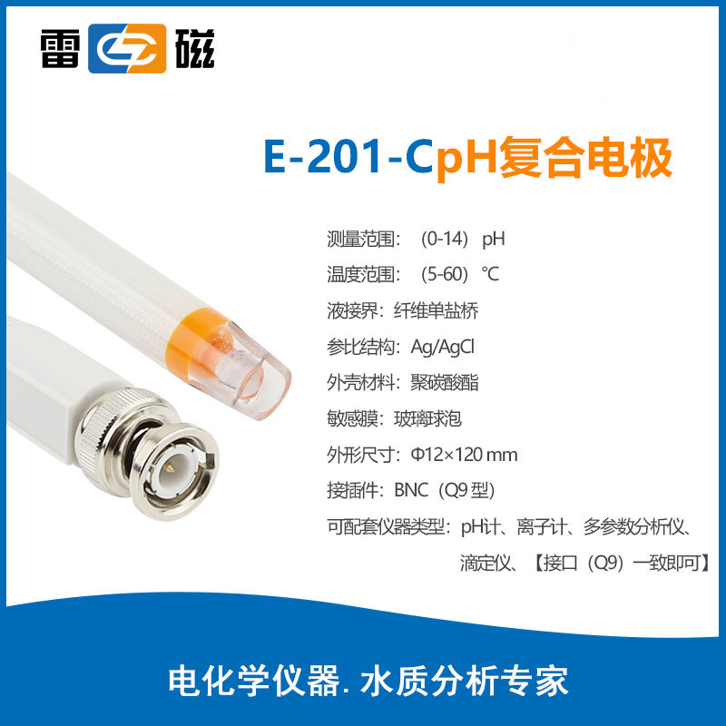 雷磁E-201-C pH复合电极是一款高性能实验室用电极,测量范围为0-14 pH,温度适用范围5-60℃。采用Ag/AgCl参比结构和玻璃球泡敏感膜,配合纤维单盐桥液接界设计,确保稳定可靠的测量结果。外壳材质为耐用聚碳酸酯,尺寸为Φ12×120mm,接口类型为标准BNC(Q9),兼容多种pH计、离子计、多参数分析仪及滴定仪。本产品为可充式设计,支持添加3.0M KCl参比液,延长使用寿命。标配电极保护瓶和电极补充液粉剂,即配即用,使用便捷。电极使用后建议清洗并保存于饱和氯化钾溶液中,以保持性能稳定。广泛应用于环境监测、工业控制和科研实验等领域。