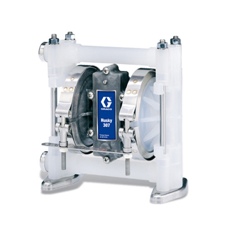 固瑞克HUSKY 307气动双隔膜泵固瑞克Husky307 3/8” 隔膜泵外形轻巧,便于携带•流量可达7 gpm (26.5 Ipm)•可在低空气压力20 psi (1.4 bar)情况下工作•空气阀和球座维修方便•运行噪音低在50psi和60cpm时为75dba规格:流体进出口尺寸 3/8 in(9.4mm)流量7gpm (26.5lpm)出口压力100psi (7bar)