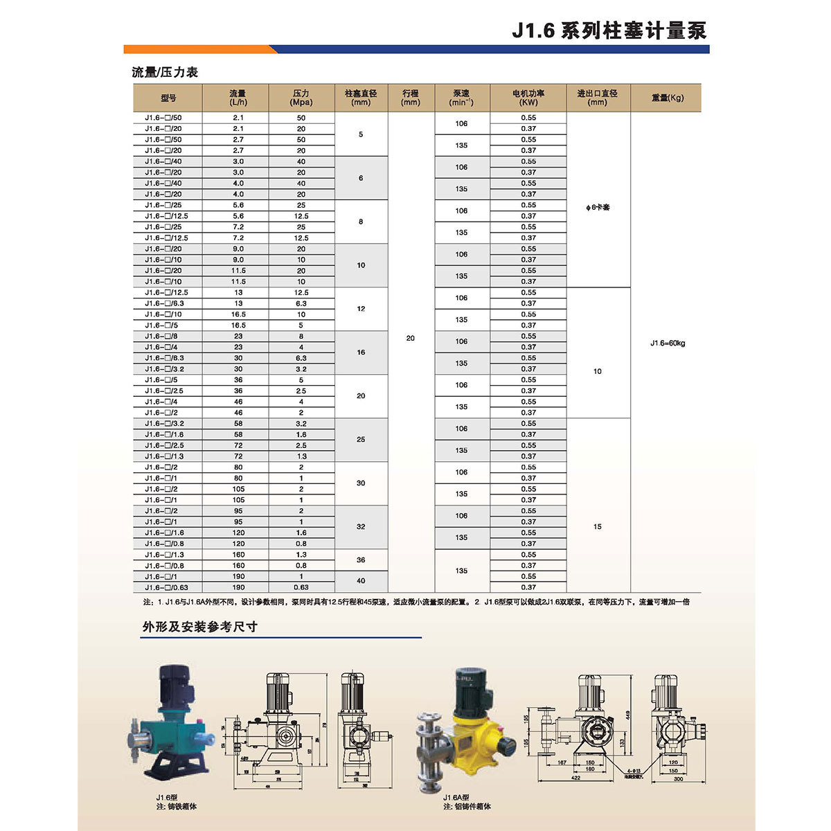 产品型号包括J1.6A、J3.0、J-D、J-T等多种规格,流量范围覆盖2.1L/h至190L/h,适配不同工况需求。柱塞直径从5mm到40mm不等,配合行程调节和变频控制,实现精确流量调控,支持远程自动化操作。