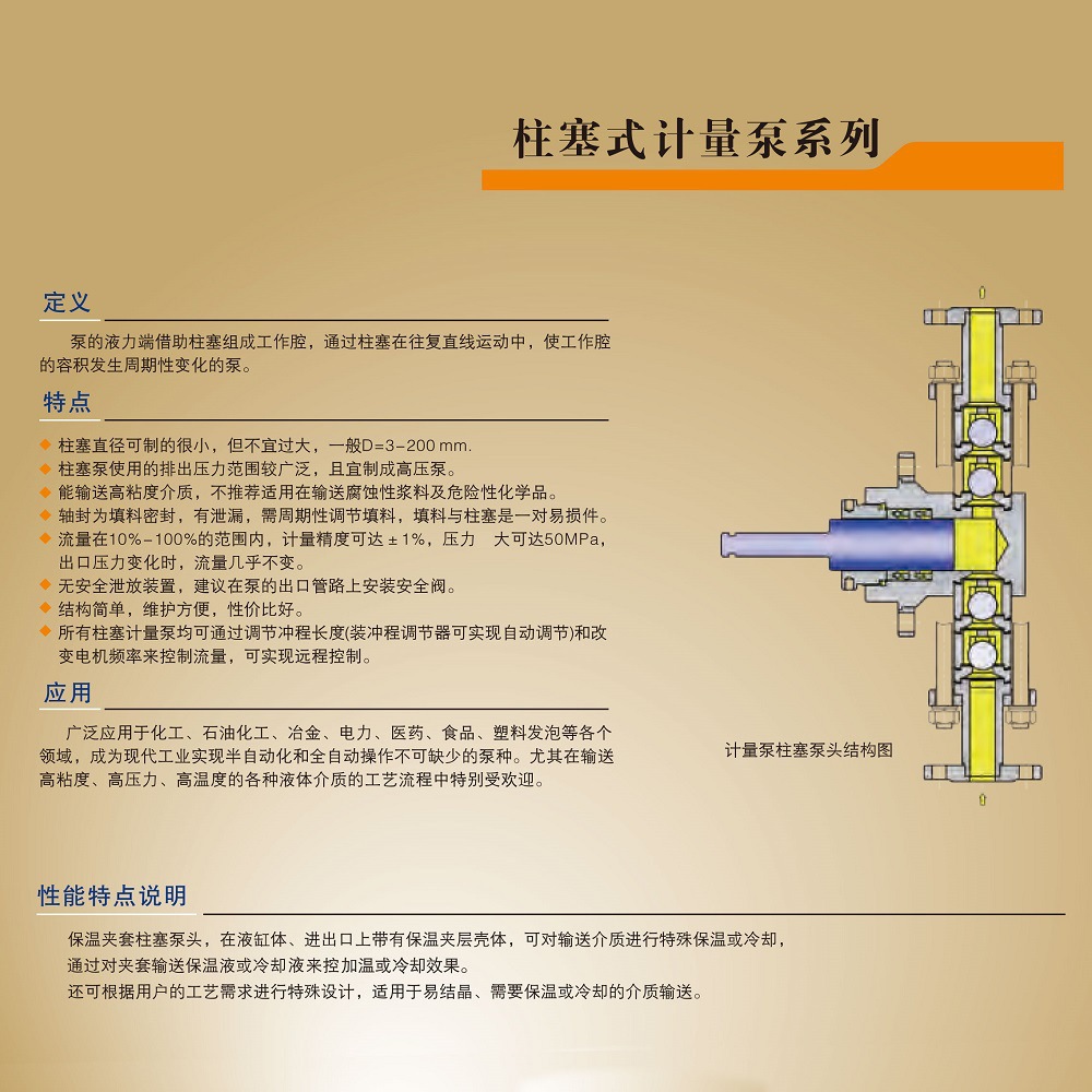 广泛应用于化工、石油化工、冶金、电力、医药、食品、塑料发泡等各个领域,成为现代工业实现半自动化和全自动操作不可缺少的泵种。尤其在输送高粘度、高压力、高温度的各种液体介质的工艺流程中特别受欢迎。