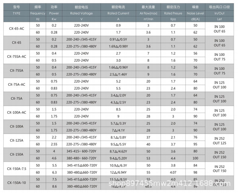 全风环保科技股份有限公司生产的CX-透浦式中压鼓风机,集吸风与排风功能于一体,适用于多种工业场景。产品采用高强度铸铝机壳,经专业车工精密加工,具备优异的防火、防腐蚀性能,确保设备长期稳定运行。配备铝制电机,支持50Hz与60Hz双频设计,并通过CE、CCC认证,安全可靠。 风机设计人性化,出风口方向可调节,便于多角度安装;标配进风口法兰,安装简便快捷。系列产品覆盖多种型号(如CX-1/4S、CX-75、CX-100、CX-150等),功率从0.2kW至8.6kW,最大流量可达55 m³/min,压力最高达4.4 kPa,满足不同工况需求。运行噪音低至50dB(A),高效节能,适合持续运转。 广泛应用于环保工程、空气处理、工业自动化、物料输送等领域,是理想的中压气流解决方案。