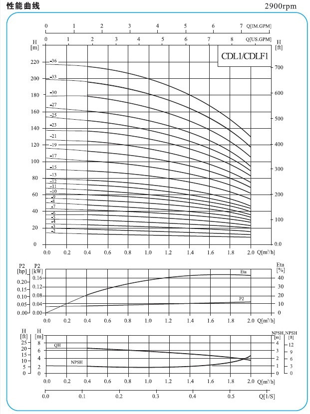 4、泵的使用参照加粗曲线的性能范围,以防流量过小产生过热和流量过大使电机过载等。